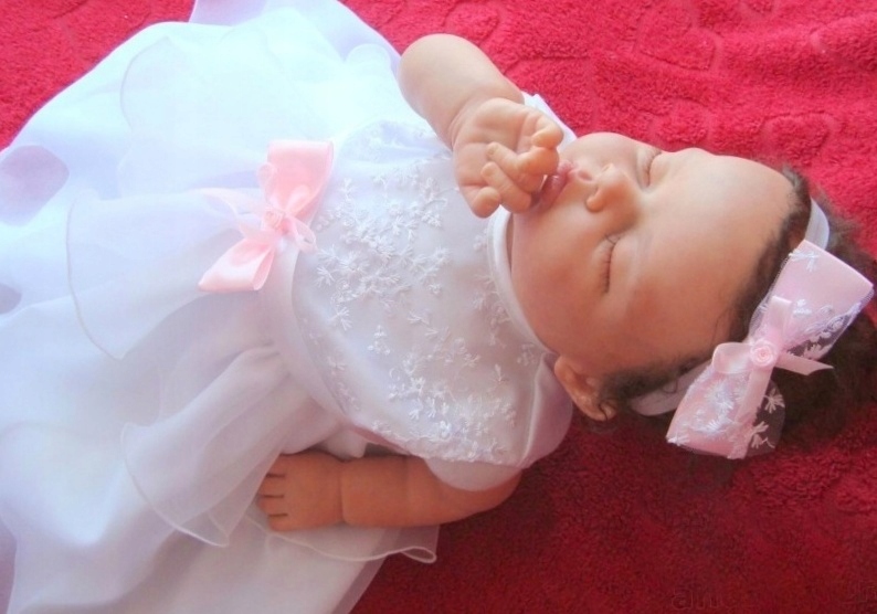 верх - виготовлена з атласу та ніжного мережива, без рукавів, зав'язується на талії стрічкою, прикрашена троянда та бант ручної роботи, застібка ззаду