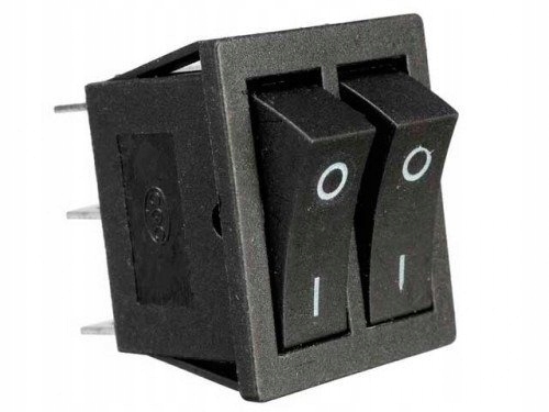 Кулисний перемикач KCD3, ON/OFF. Подвійний перемикач має стандартні 6PIN контакти для пайки проводів або вставки автомобільного роз'єму 6,3 мм. Містить дві незалежні одиночні схеми.