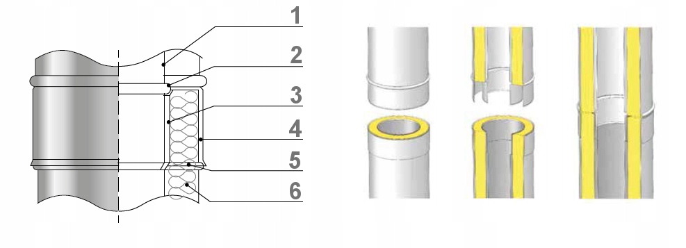 Труба з кожухом є готовим елементом, який ідеально підходить для з'єднання ізольованого сталевого або керамічного димоходу за допомогою з'єднувальних елементів (коліна/труби) з товстої чорної сталі. Труба має так звану підкладку, тобто герметичний розтруб шириною 6 мм, що дозволяє вставляти інший елемент без необхідності встановлення додаткових переходів, з’єднувачів тощо. На кінці, з боку підкладки, труба має естетичний ізоляційний кінець.