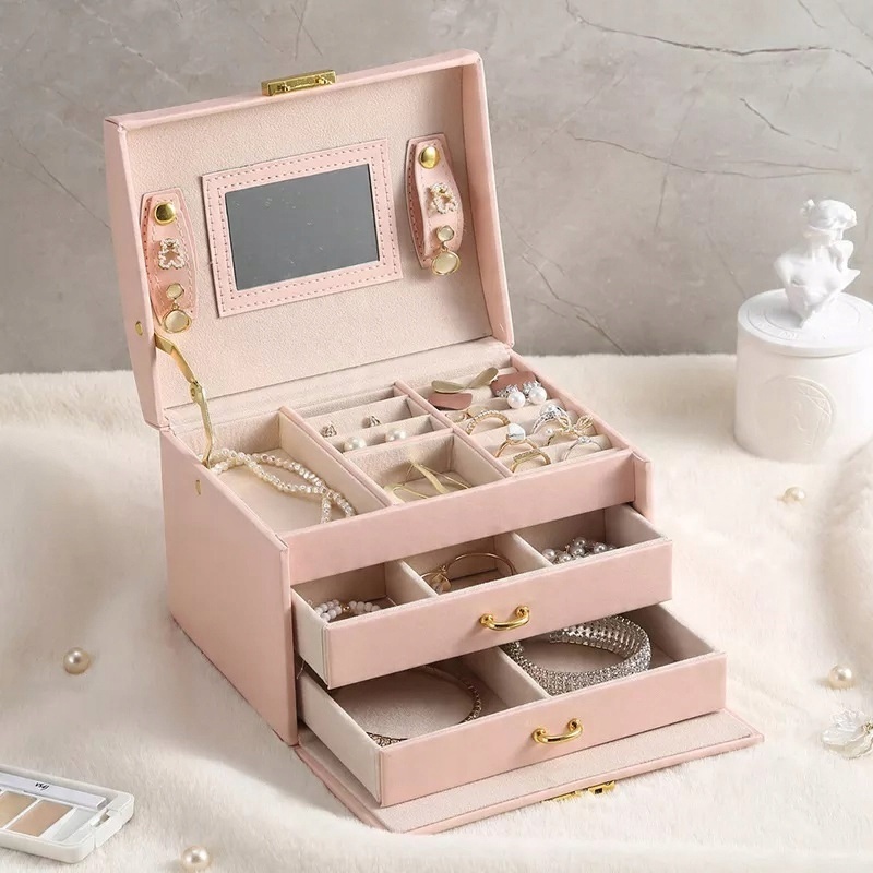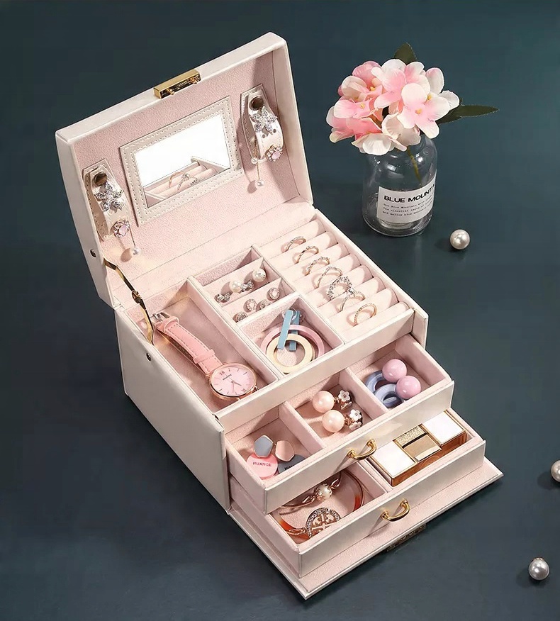 Практична коробка має 20 різних відділеньі поглиблень, завдяки яким ви можете контролювати порядок вашої колекції . Крім відділень, коробка також має 2 шухляди, що висуваються незалежно. Відділення бувають різних розмірів і ідеально підходять для зберігання годинників, браслетів, ланцюжків, сережок і навіть монет або флешок із важливими даними. Посередині також є дзеркало, яке ідеально підходить для одягання сережок або інших прикрас.