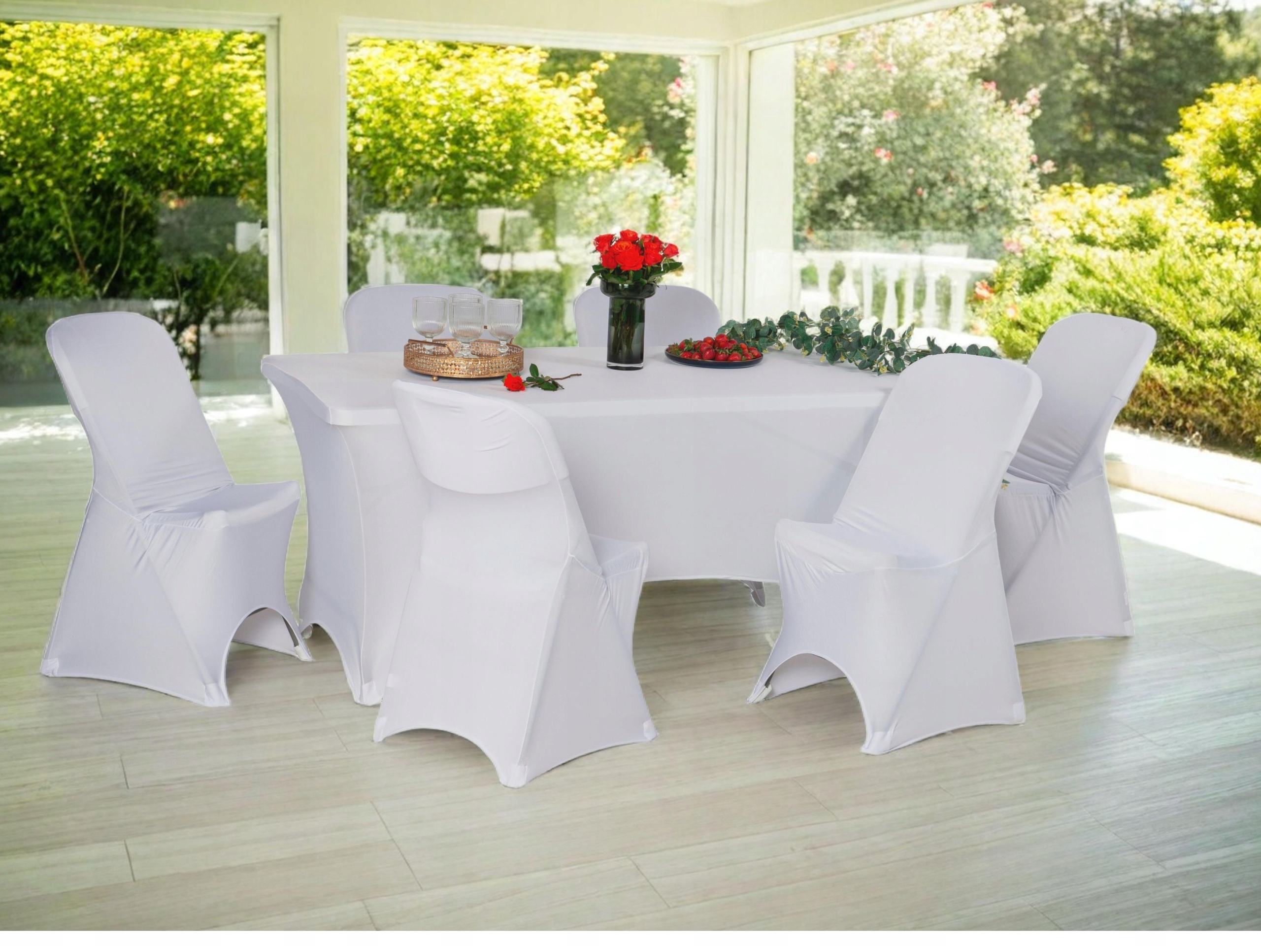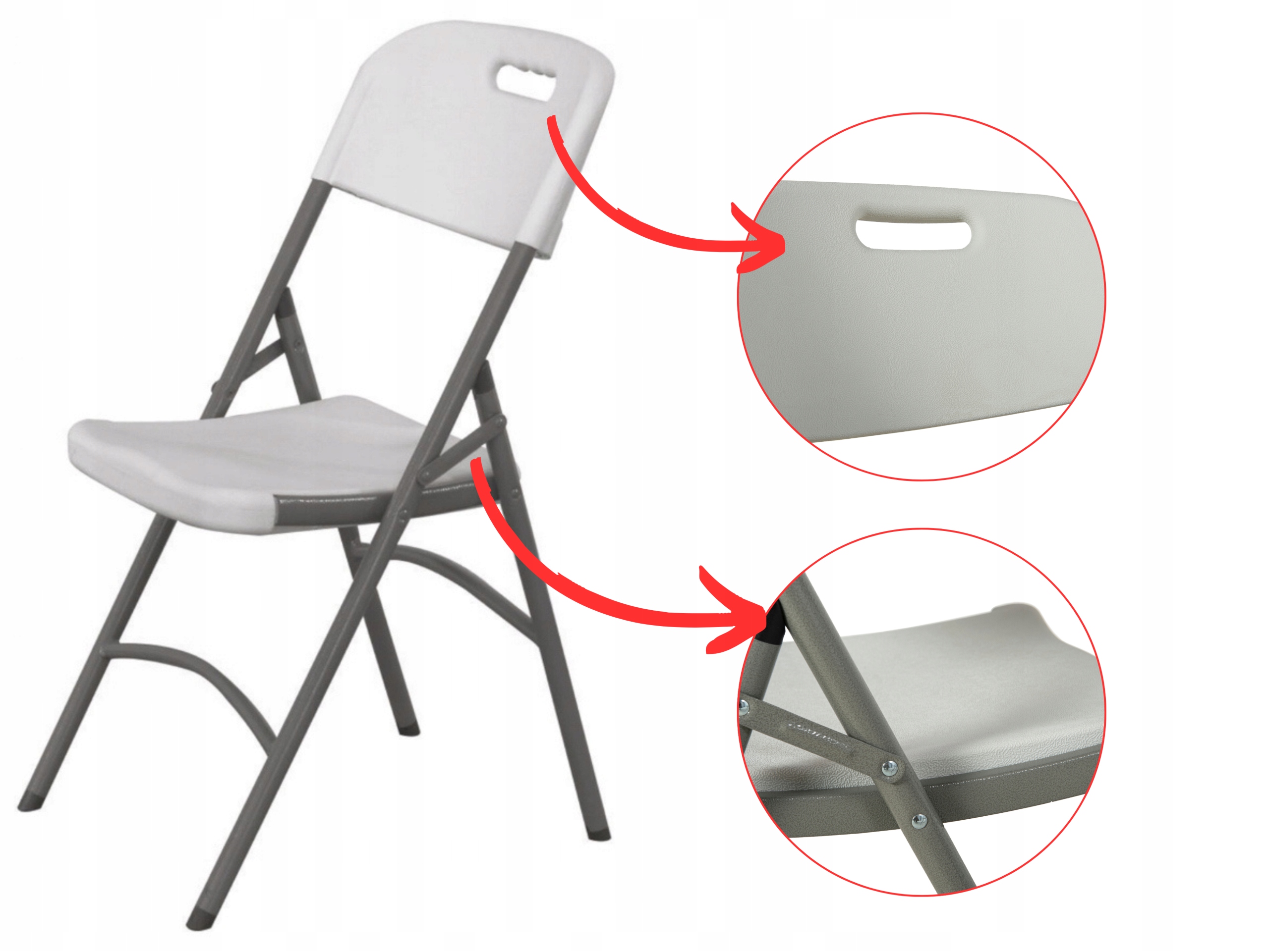 Цей набір садових меблів складається з 6 білих складних стільців і білого складного столу та чохлів, що робить його ідеальним варіантом для різноманітних свят. Конструкція виготовлена з сталі з порошковим покриттям забезпечує високу стабільність. Стіл має зручну ручку, переносити стільці вагою 4 кг також не становить великої проблеми. Ніжки столу та стільців мають нековзкі ніжки, які забезпечують стійкість.