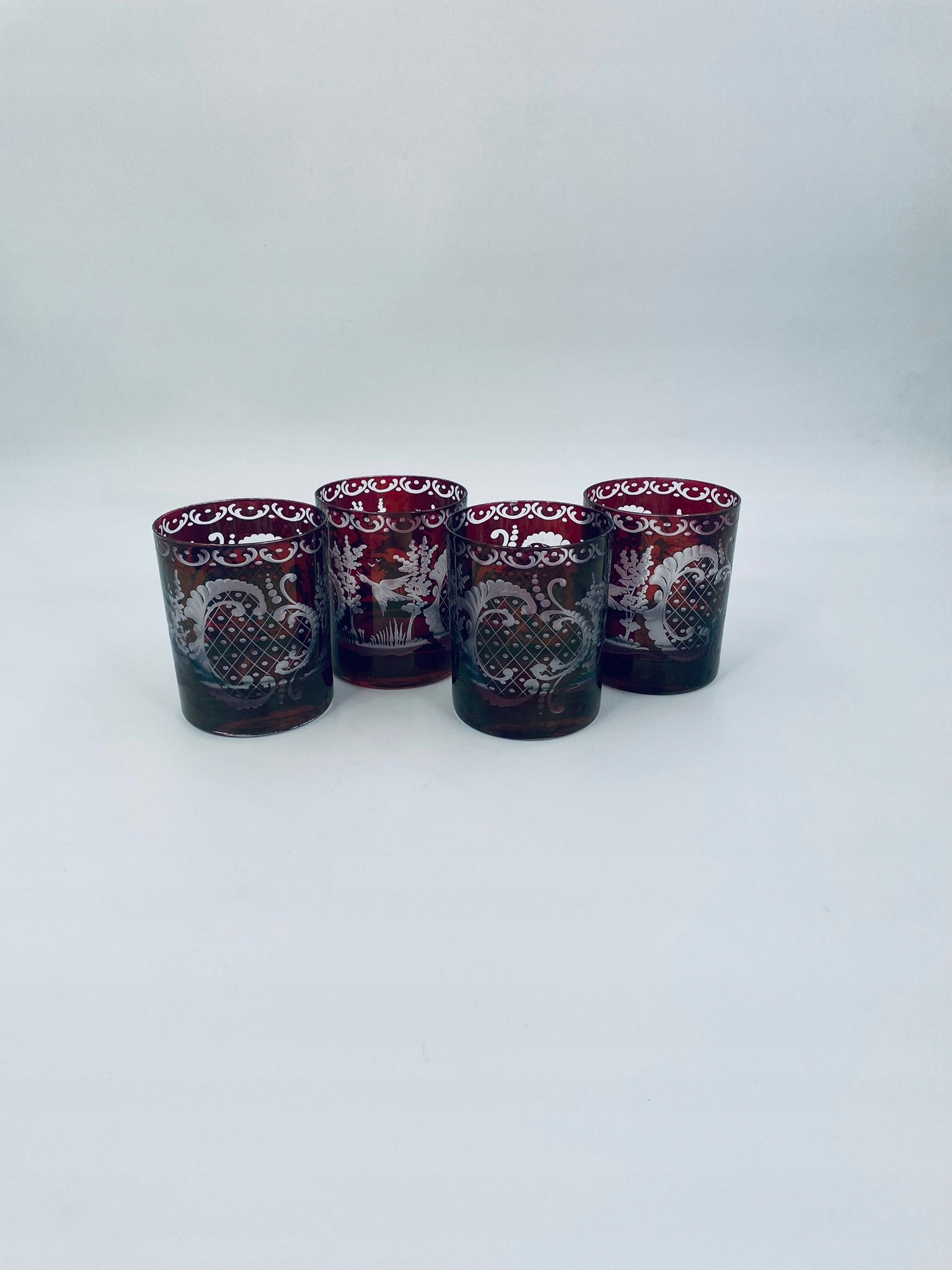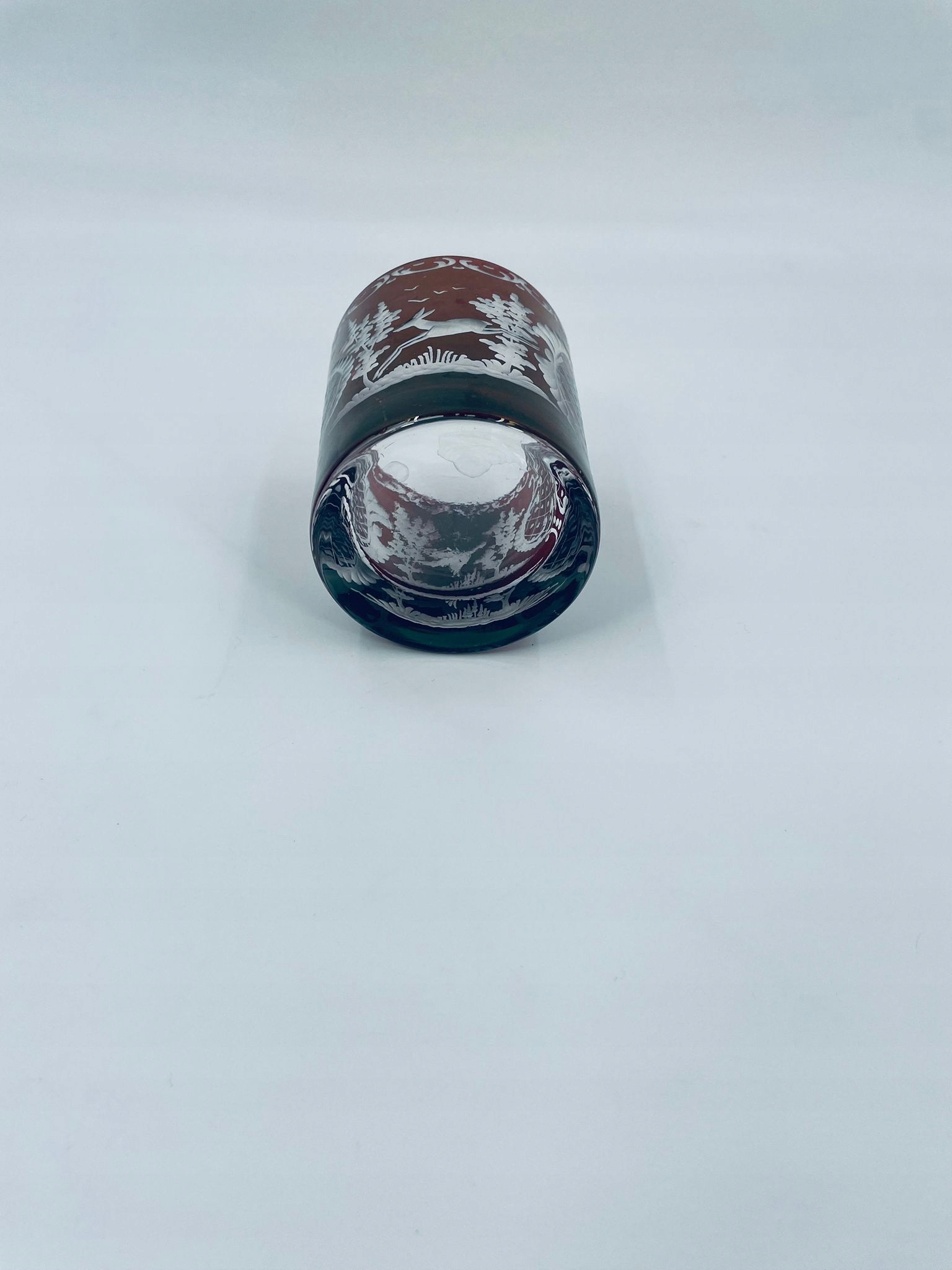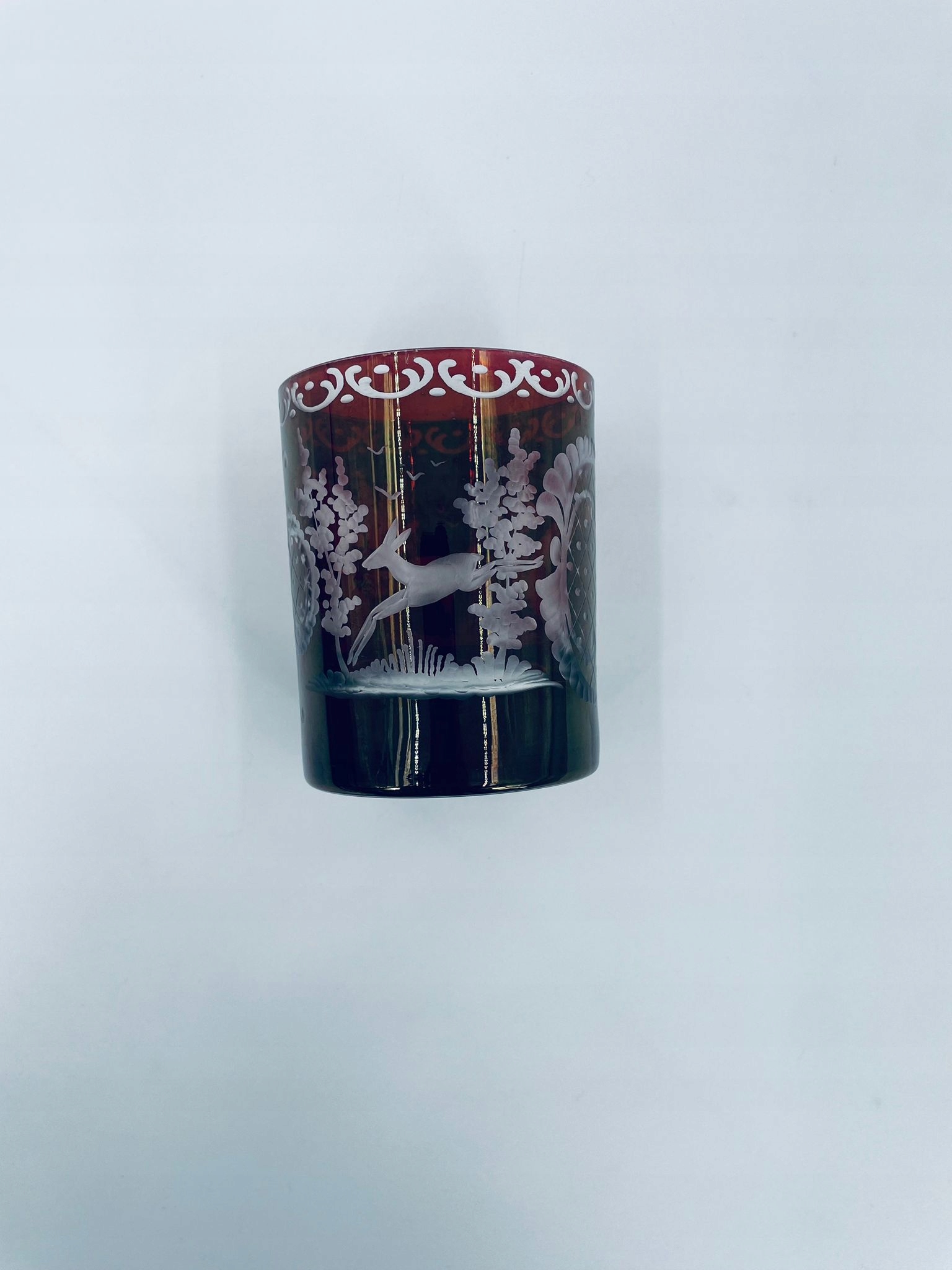 Скло з чехівської кришталевої богемії з інтенсивним кольором рубіну. Скло має багаті прикраси, що зображують сцену з птахом, оточеною рослинністю, також в декоративному малюнку на верхньому краю.