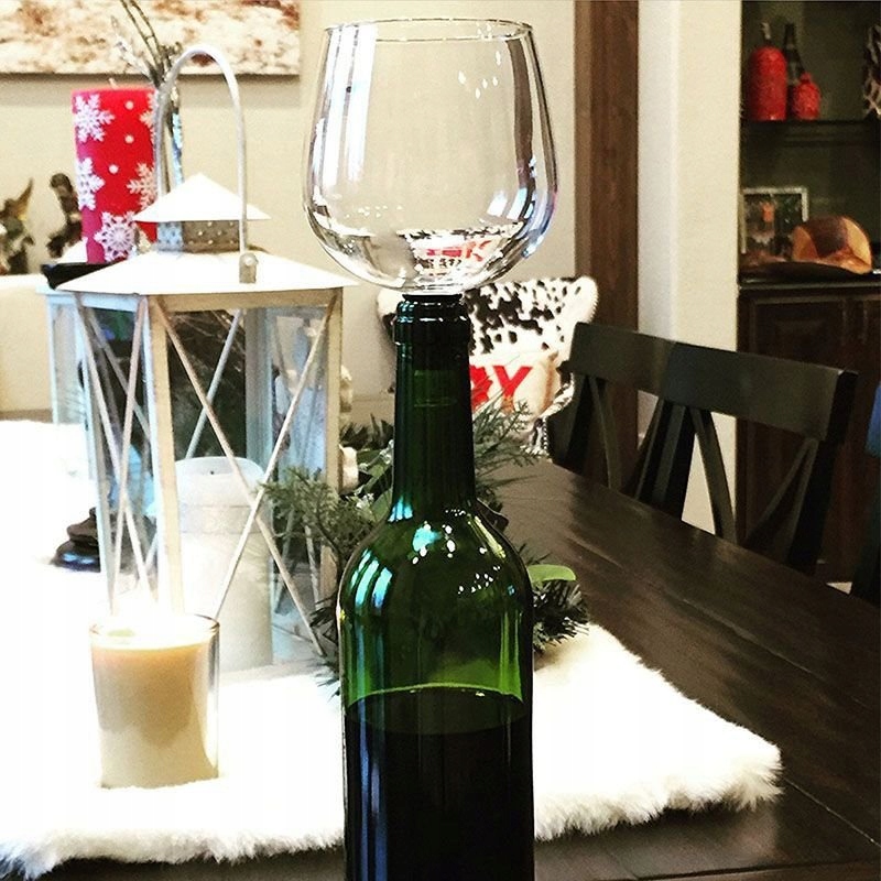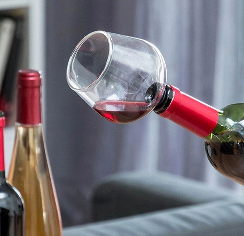 Незвичайний келих, який дозволяє почати пити вино прямо з пляшки. Замість ніжки келих має спеціальну силіконову пробку, яка не дасть напою розлитися. Дуже корисний гаджет, який можна використовувати як кумедне пристосування для вечірок, зручне рішення для винних вечорів або елемент полегшення дегустації.