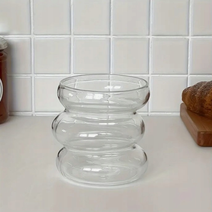 Сучасна склянка для напоїв, кави, соку, напоїв або молока. Нерегулярна форма надає йому унікального характеру і кидає очі. Високоякісне борозильне скло підходить для подачі як гарячих, так і холодних напоїв.