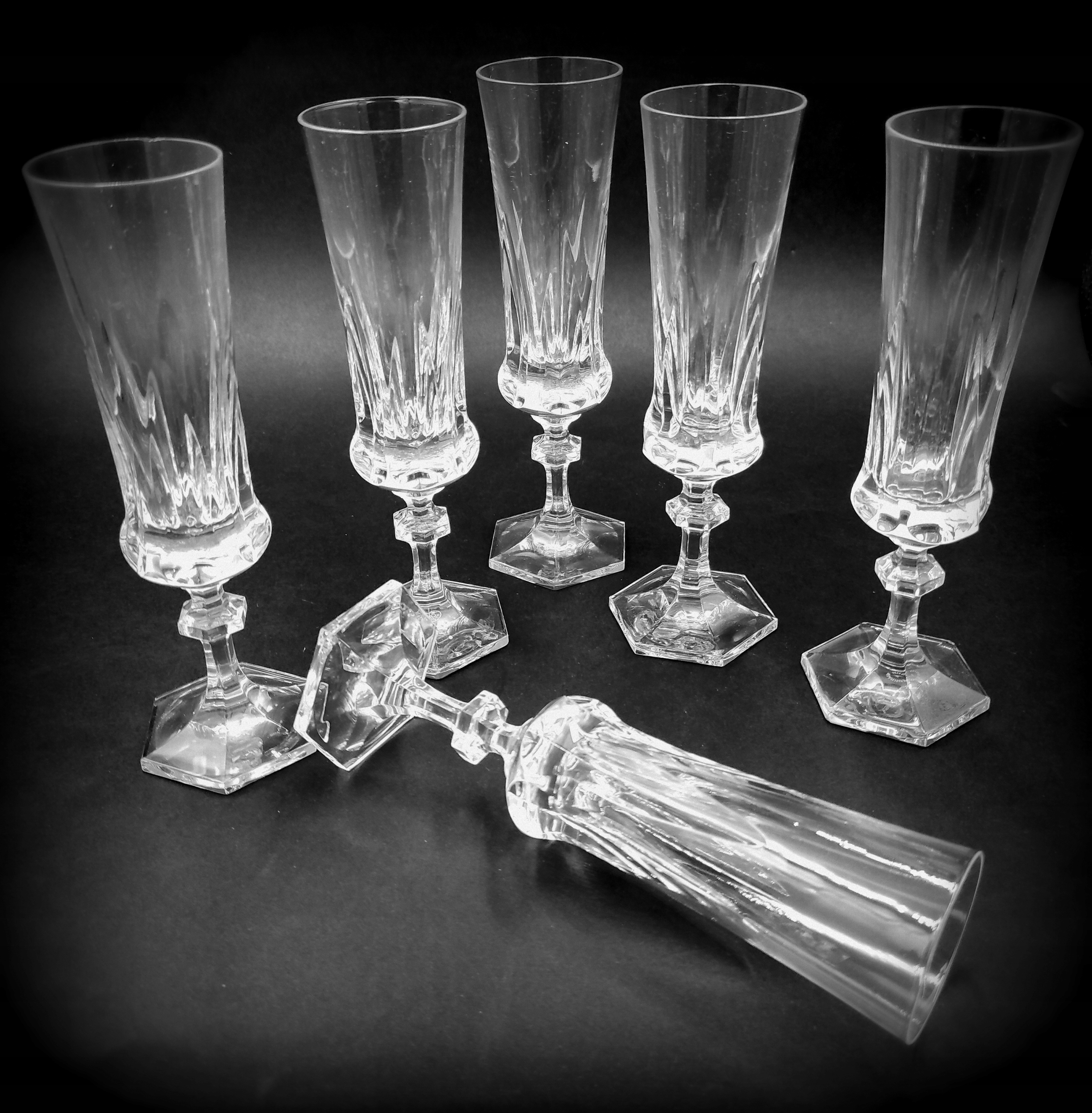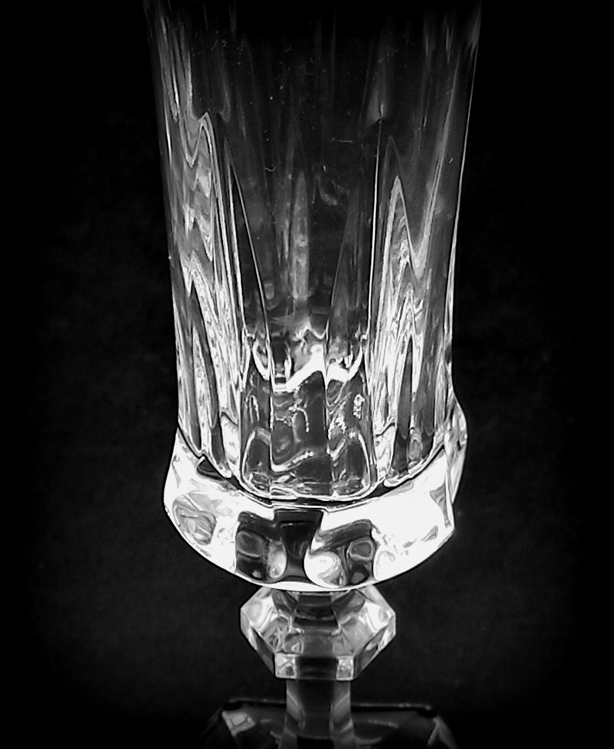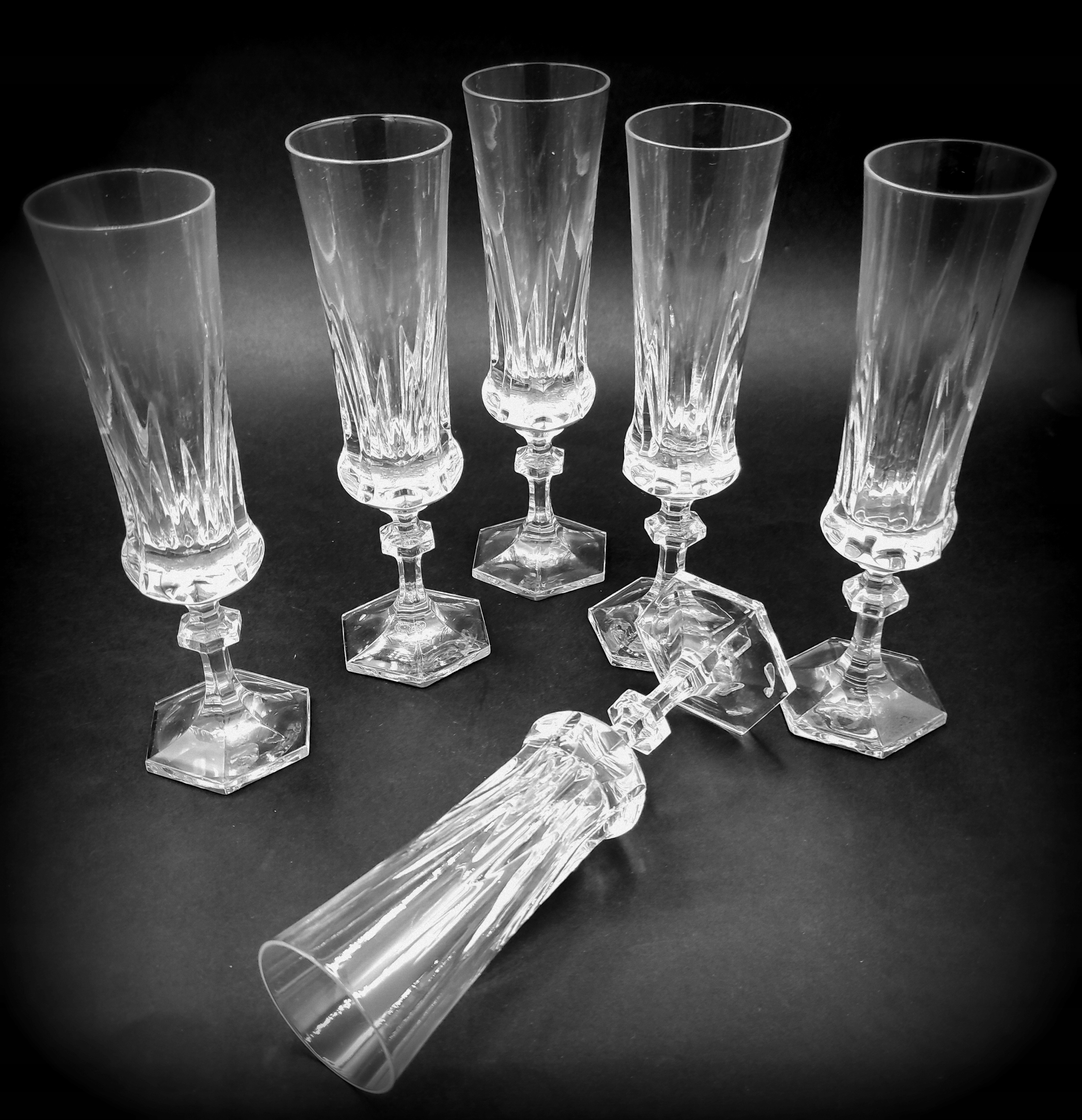 Вони походять з 2000 року з колекції ROYAL. Модель дуже гарного крою з восьмикутним коміром на елегантному восьмикутному постаменті. Виготовлений з кришталю найвищої якості. Високі, тонкі і дуже гарно профільовані келихи зроблять кожне подане в них шампанське зіркою вечора, а кожен гість зможе насолодитися бульбашками з цього королівського кришталю.