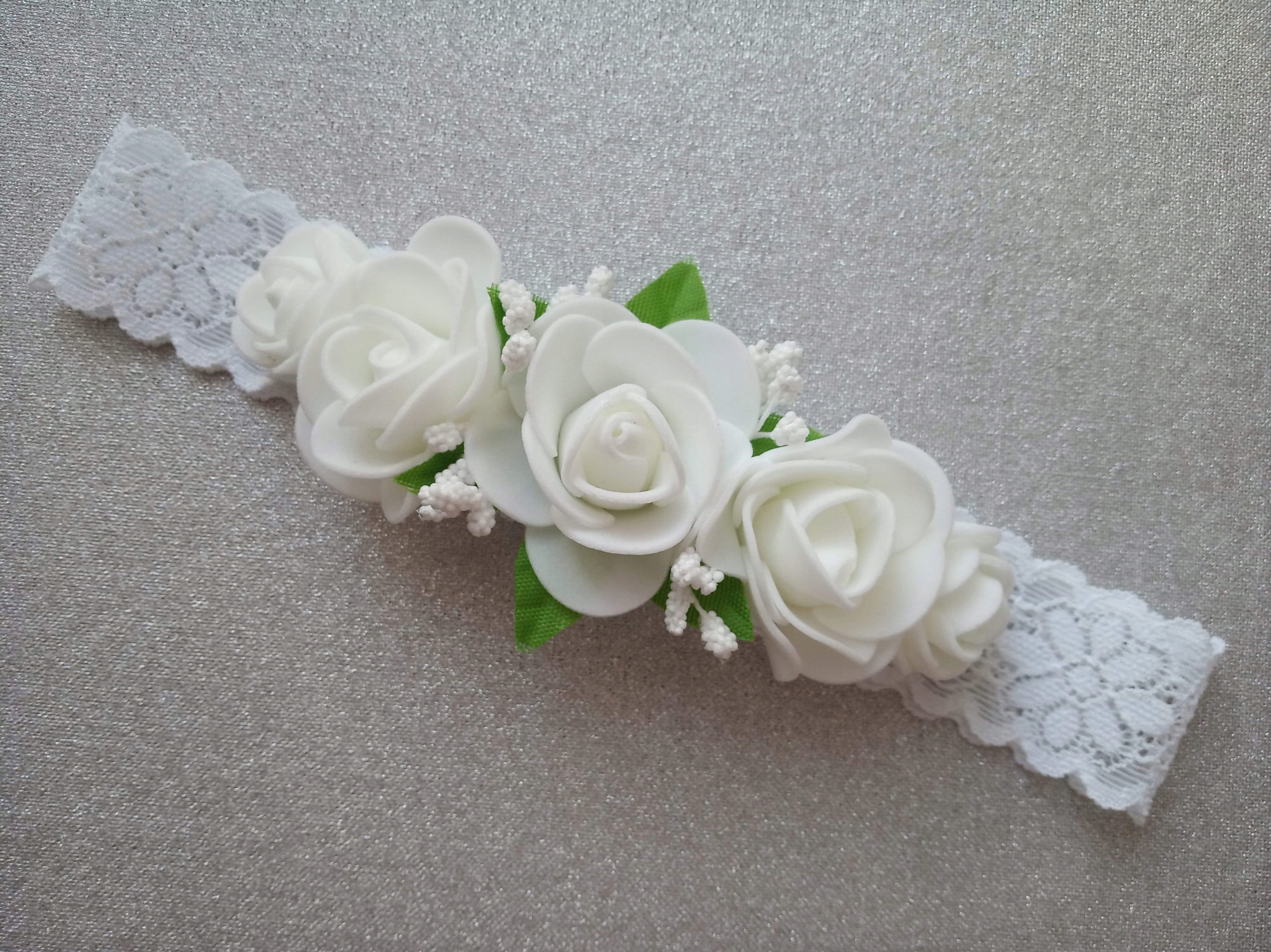 Красива мереживна пов'язка WHITE - пов'язка з красивого еластичного мережива, прикрашена квітами та іншими ніжними прикрасами.