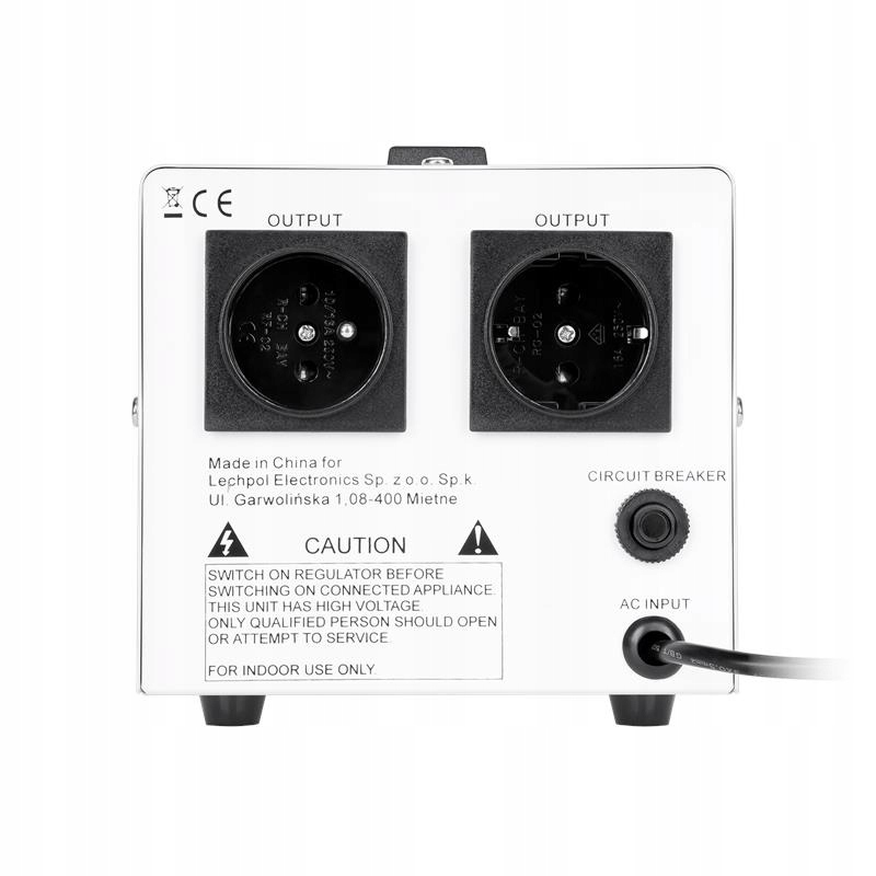 - Вимикач живлення (якщо перевищено обмеження навантаження, пристрій автоматично вимкнеться). вимкнено, щоб знову увімкнути стабілізатор, зменшіть навантаження та поставте перемикач живлення в положення "УВІМК.")