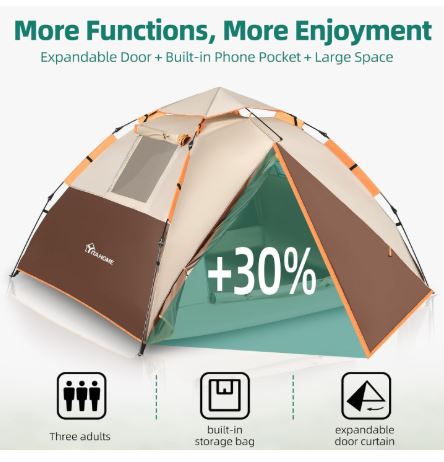 достатньо місця для 2-3 людей: оновлений великий намет може вмістити щонайменше 2 дорослих і має розміри 240 х 210 х 135 см. Вбудований кишеньковий мобільний телефон гарантує, що ваші речі залишатимуться чистими та впорядкованими. Після складання намет має розміри лише 75x17x17 см, що дозволяє легко перенести і дозволяє комфортну і приємну подорож.