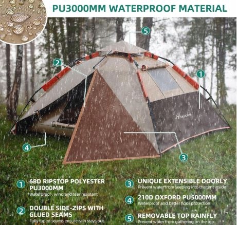 справжній зовнішній намет з подвійними стінами: зовнішній намет виготовлений з тканини Oxford 210D з високою водостійкою до 5000 мм, тоді як внутрішній намет виготовлений з МОСКІТО та Оксфордської тканини. Склопластикові щогли є вітряними, а вентиляція, стійкість до дощу та знімне полотно зовнішнього намету забезпечують стабільність намету у кожну погоду. Намет міцний, водонепроникний і стійкий до комах.