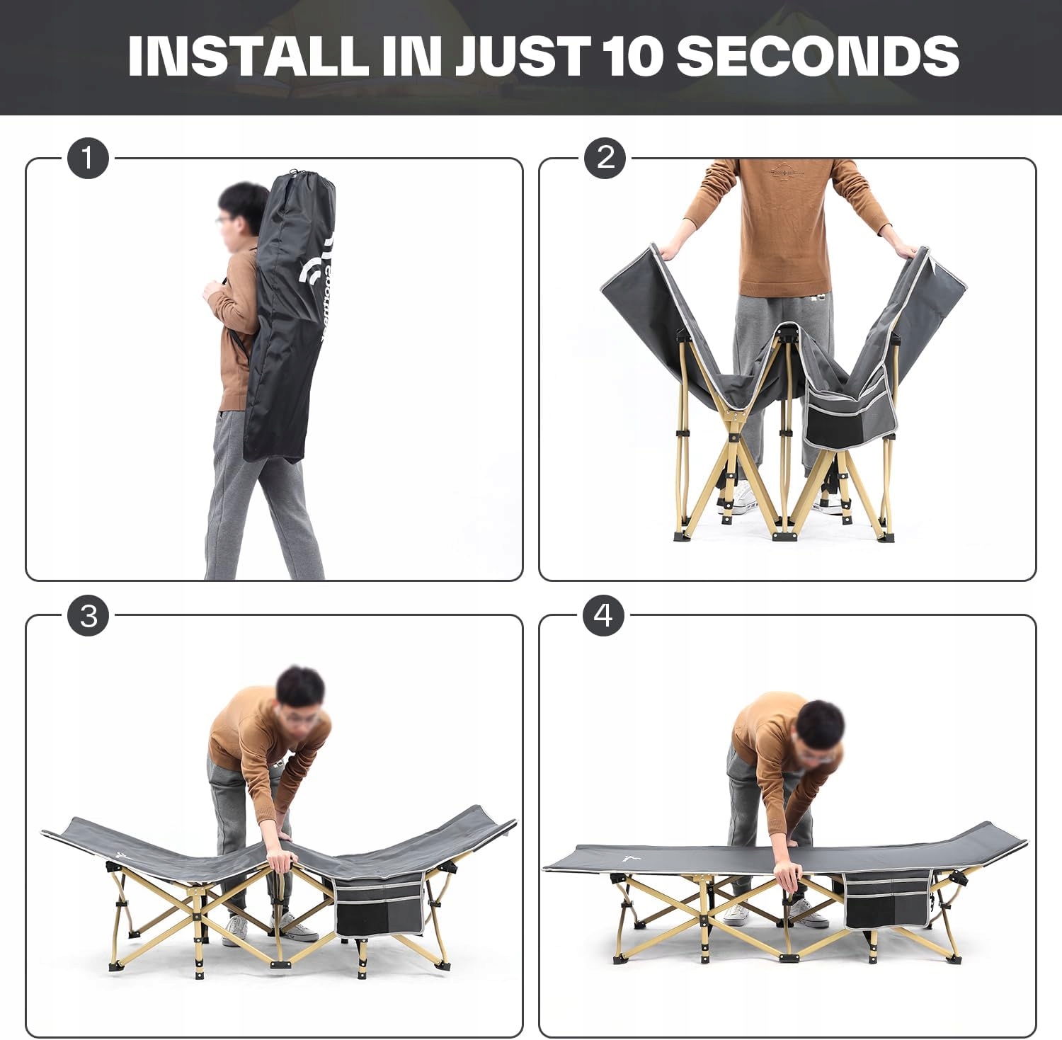 Останнє, що ти хочеш, коли приходить час спати , у вас складна конфігурація ліжка! На щастя, кемпінговий лежак можна скласти за лічені секунди, а коли ви будете готові зберігати це зручне портативне кемпінгове ліжко, його можна скласти в сумку для зберігання менш ніж за 10 секунд