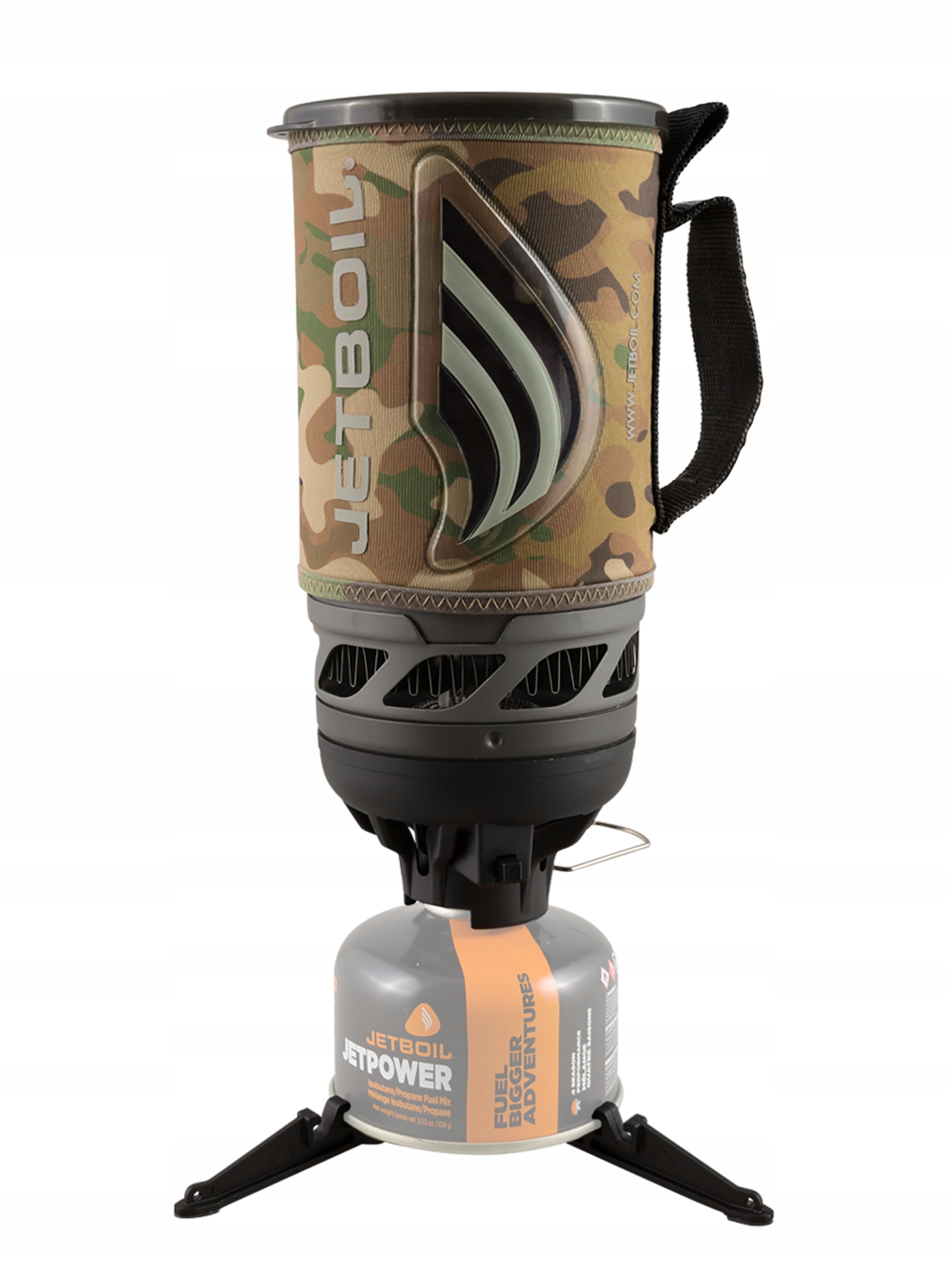 Система Jetboil Flash Cooking System - камуфляжна кемпінгова плита значно скорочує час приготування завдяки ефективному полум'ю. Більше того, плита має п’єзоелектричний запальник, який дозволяє створити іскру для її запуску. У моделі використовується рішення FluxRing. Ця назва відноситься до радіатора, розробленого брендом Jetboil, розміщеного під каструлею, що дозволяє краще використовувати тепло від конфорки. Радіатор FluxRing не тільки рівномірно розподіляє тепло, але й дозволяє воді кипіти швидше, ніж у класичних моделях без цього рішення.