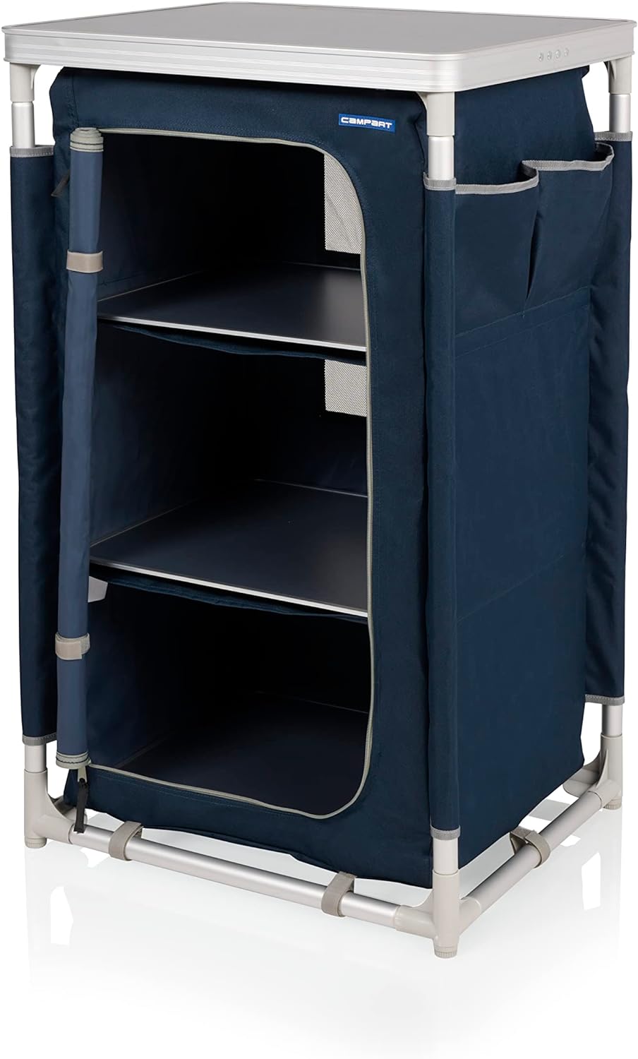 Кемпінгова шафа має три відділення, які забезпечують багато місця для зберігання. Тканина виготовлена з поліестеру 600 D, що робить її надзвичайно міцною. Шафа має хорошу вентиляцію завдяки сітці на задній частині шафи. Чотири регульовані ніжки дозволяють регулювати, щоб забезпечити додаткову стабільність. Крім того, кемпінгова шафа Campart Travel має інноваційну систему складання, яка дозволяє легко складати її в сумку для зберігання. Верхню частину шафи також дуже легко чистити.