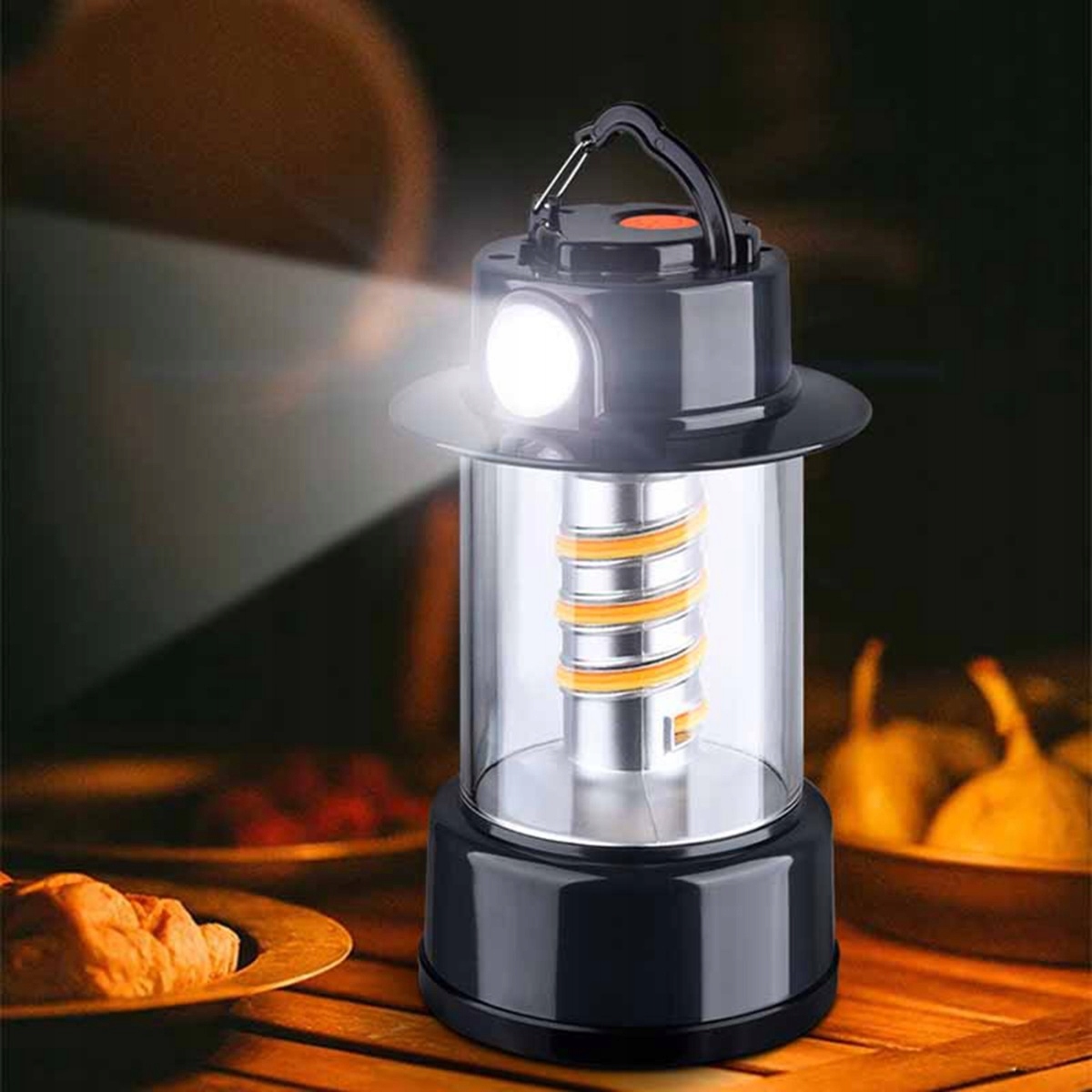 Портативний і зручний дизайн: розроблений для портативності та простоти використання, цей кемпінговий ліхтар має прихований гачок для зручного підвішування під час кемпінгу чи інших заходів. Його компактні розміри (16,5 см x 9 см x 9 см) і легка конструкція дозволяють легко носити його в рюкзаку або автомобілі. Конструкція ABS гарантує, що він може витримувати суворе використання на відкритому повітрі, а щоденна водонепроникність захищає його від бризок і легкого дощу. Цей світлодіодний ліхтарик ідеально підходить для походів, кемпінгу, патрулювання та повсякденних надзвичайних ситуацій. Оснащена режимом подвійного освітлення, ця лампа має м’яке світло на 360 градусів і потужний промінь великої дальності.