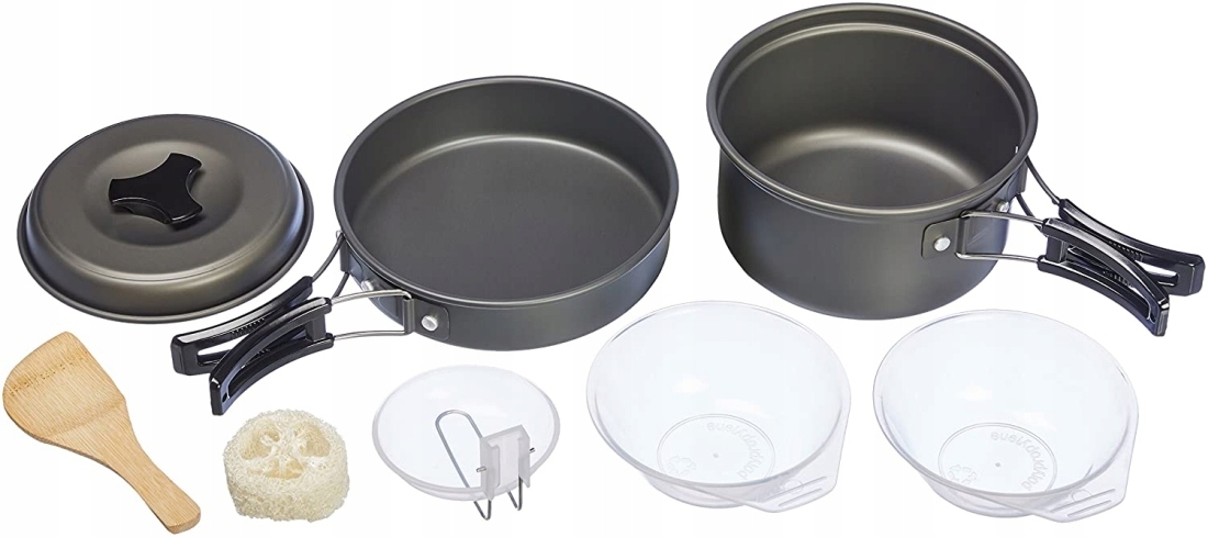 - Набір кухонного посуду для відкритого кемпінгу з закритою каструлею та сковородою, як а також лопатка, черпак, ложка та 2 миски