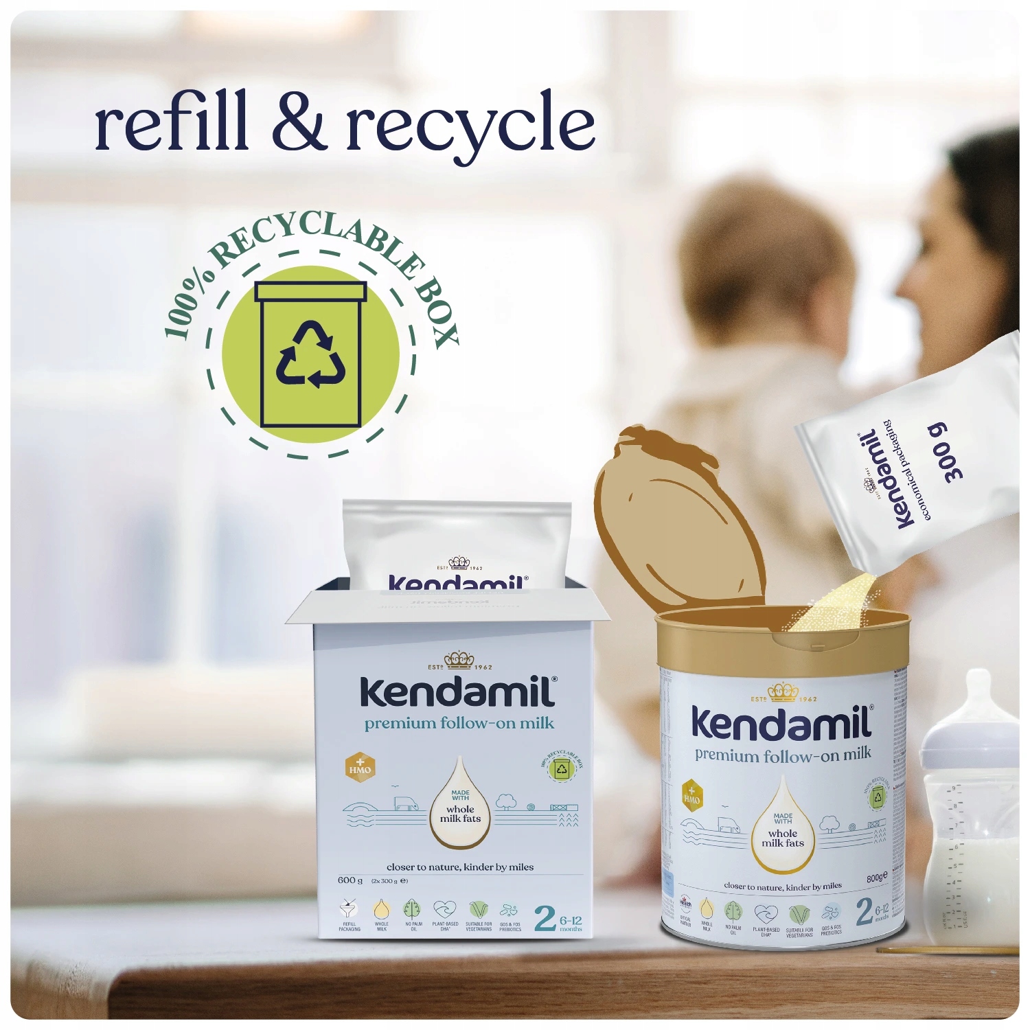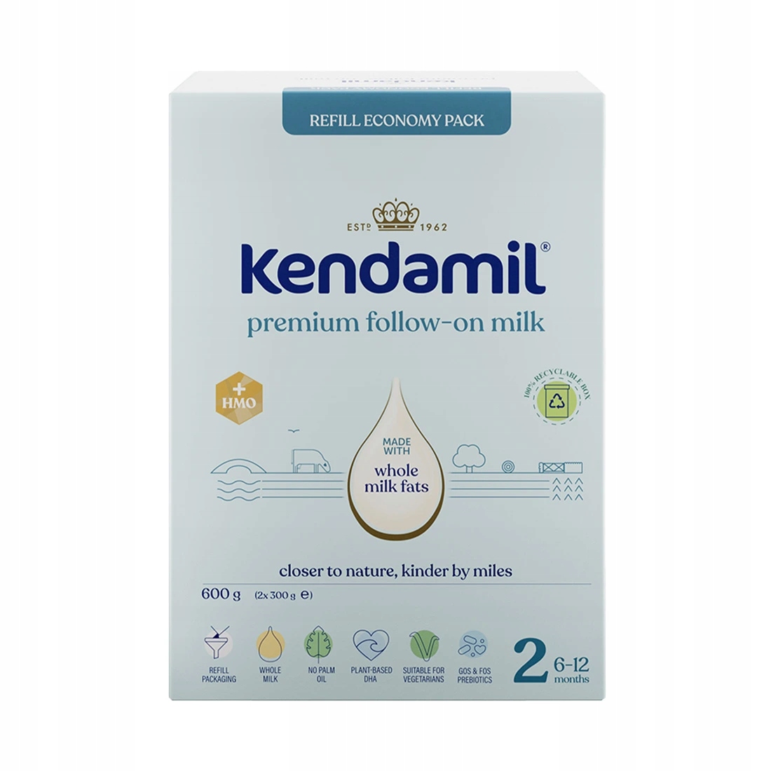 Нова вдосконалена формула з олігосахаридом грудного молока HMO (3'GL) і пребіотиками (GOS і FOS) базується на більш ніж 60-річних дослідженнях і розробках. Дитяче молочко Kendamil натхненно найкращим у природі. Його основу становить високоякісне жирне коров'яче молоко з натуральною молочною жирністю, аналогічною материнському. Призначений для малюків від 6 місяців до року. Упаковка повністю придатна для переробки.