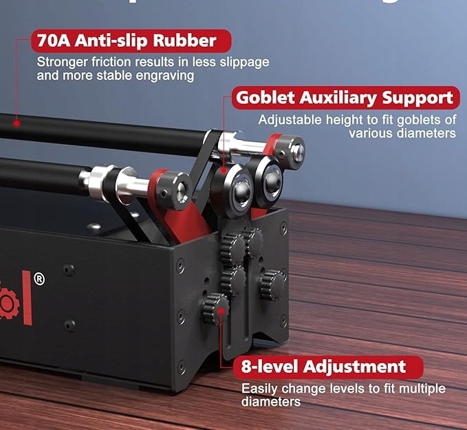 - 【Інтегрована структура безпеки】 Концентрична структура підтримує рух ремінців з обох боків, завдяки якому гравюру є більш точним. Закрите будівництво, двигун не піддається впливу, що безпечніше. Ролики мають виступаючу структуру, а довжина гравірованого предмета не обмежена. Діаметр можна встановити на 8 рівнів, а діаметр гравюри може бути до 6 мм і до 100 мм, щоб відповідати більш гравірувальним вимогам.