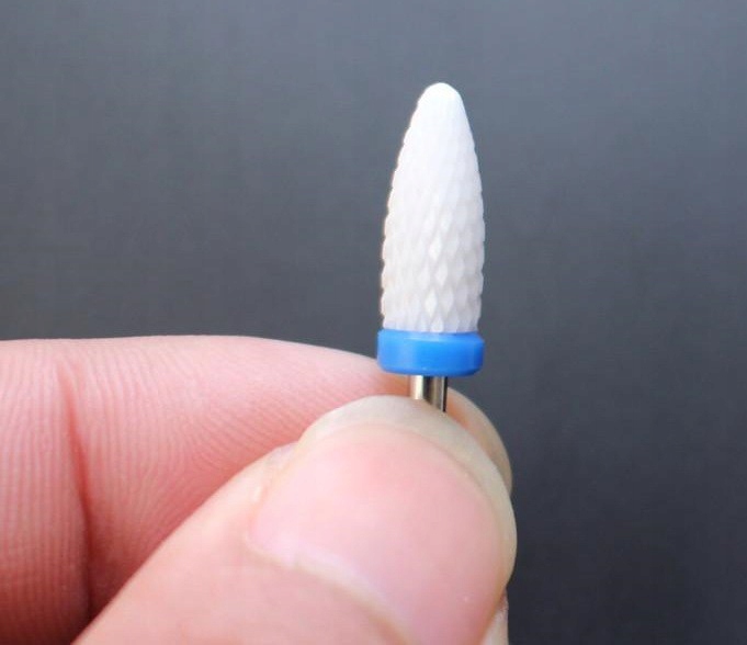 Керамічний фрез конусоподібної форми використовується для видалення маси з усієї нігтьової пластини та важкодоступних країв.