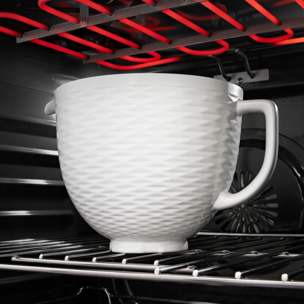 Стильна керамічна чаша об'ємом 4,7 л. Він призначений для роботи з міксерами з поворотною головкою KitchenAid іArtisan 125/175/185 і Classic, а також для багатьох інших застосувань на кухні. Його поверхня стійка до зміни кольору, відколів і тріщин, а також до поглинання запахів, що робить його також гігієнічною посудиною для зберігання харчових продуктів. Ідеальний посуд для замісу дріжджового тіста або хліба на заквасці.