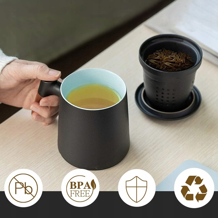 Керамічна чашка для чаю з заваркою і кришкою, 400 мл, чорна, матова