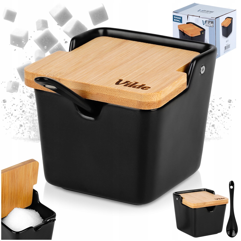 ✅ Виготовлена з кераміки та бамбука - Цукорниця та ложка виготовлені з кераміки найвищої якості в елегантному чорному кольорі. Кришка з бамбукового дерева. За умови правильного використання він прослужить багато років.