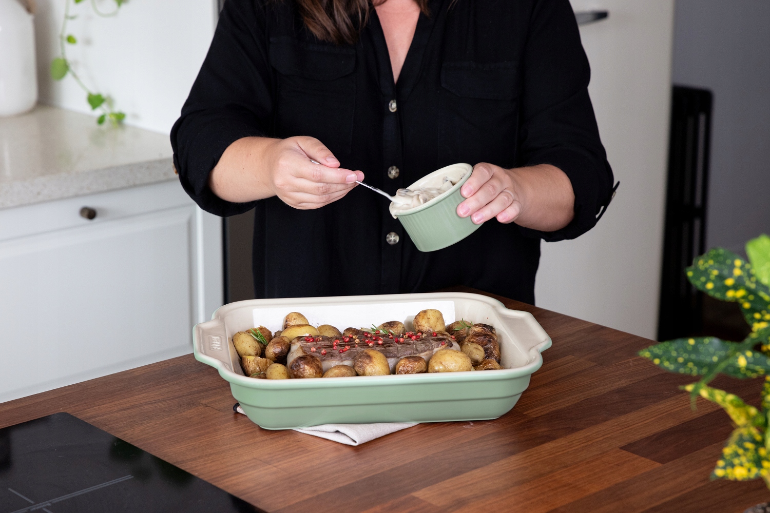 Випічка, запіканка, лазань ... все можливо в нашій барвистому керамічному блюді для випічки! Його натуральний колір піску-беї приносить трохи тепла, щоб перемістити їх з духовки до центру столу, не втрачаючи ритму.