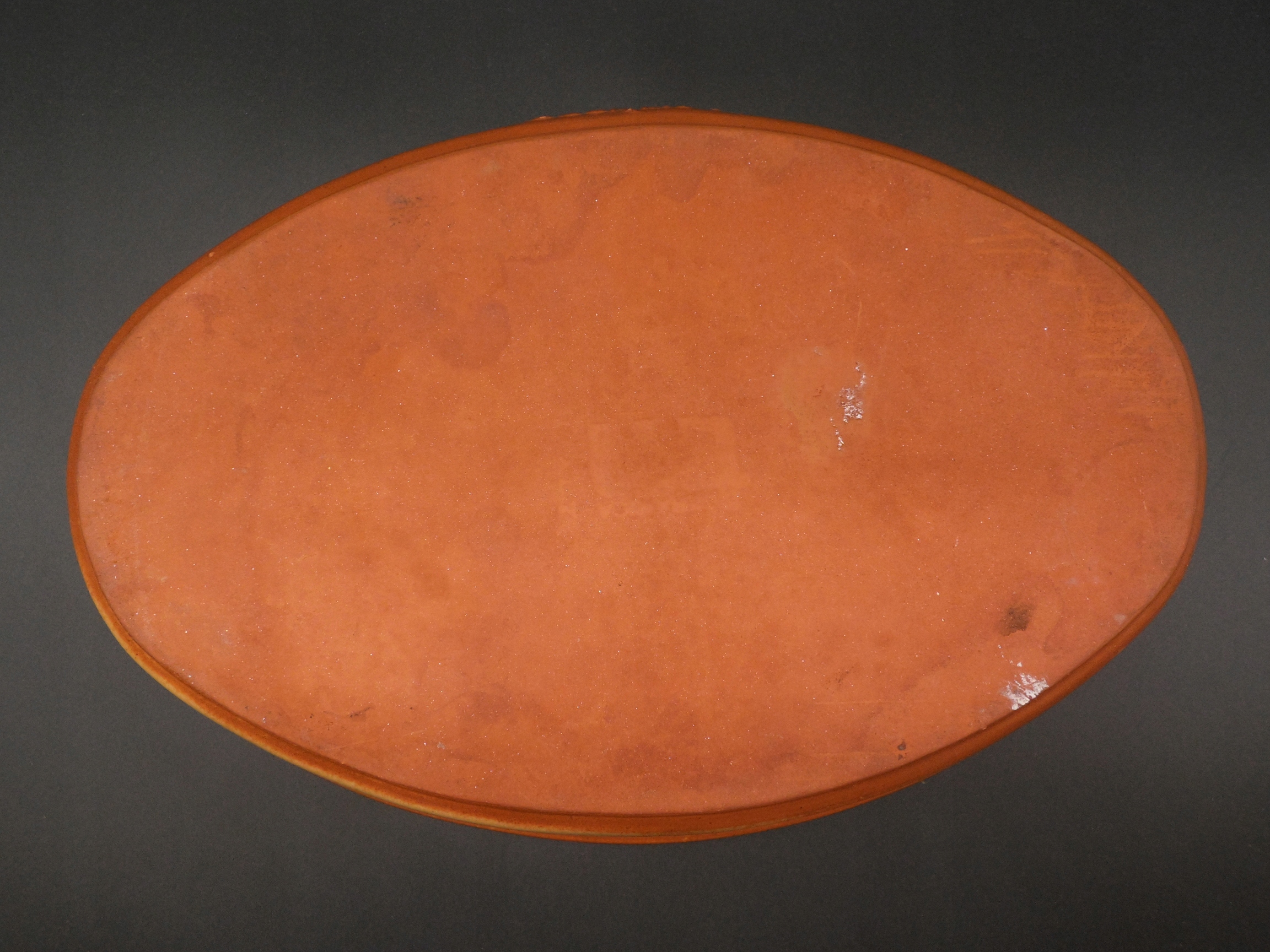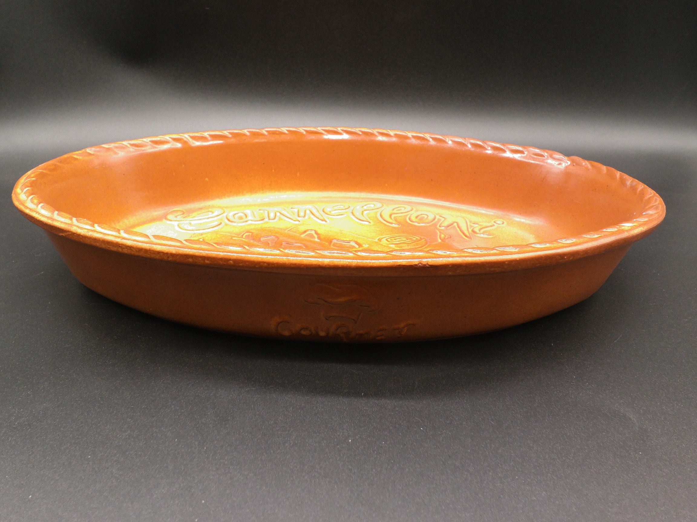 - Має овальну форму з декоративним плетеним краєм і тисненим візерунком на дні із зображенням трубочок каннеллоні, грибів і зелені та написом «Cannelloni».