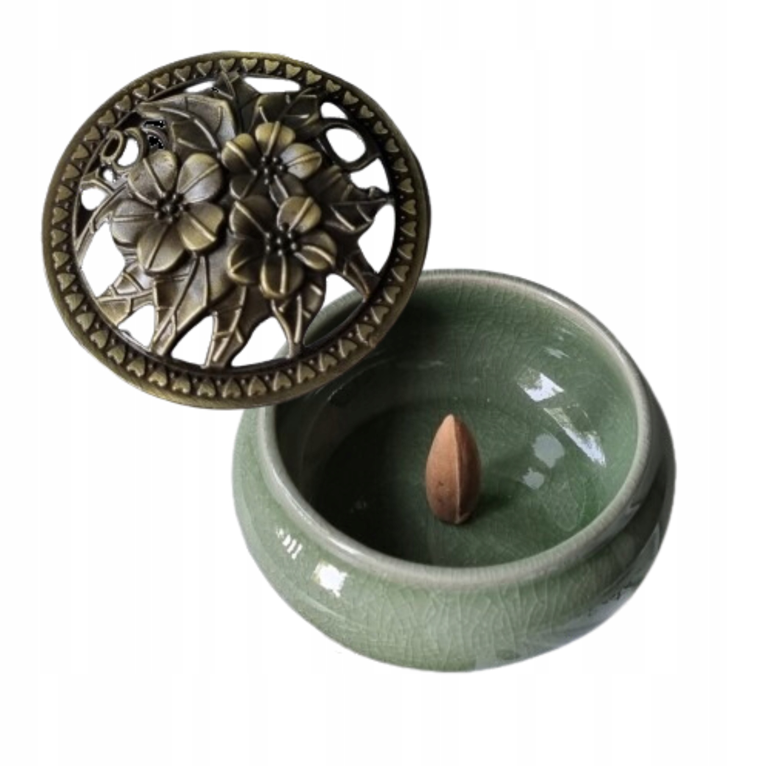 - виготовлений з високоякісної кераміки, світло-зеленого кольоруз кришкою з металу, яка прикрашена гарним ажурним візерунком, що забезпечує оптимальні умови для рівномірного горіння ладану та поширення запаху,