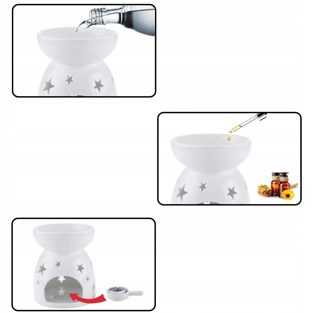 Виготовлена з білої високоякісної глазурованої кераміки та обпалена при 1380 градусах Цельсія, ароматична лампа міцніша, блискуча, стійка до високих температур і її легко мити. Тому він ідеально підходить для плавлення воску та спалювання ефірних масел.