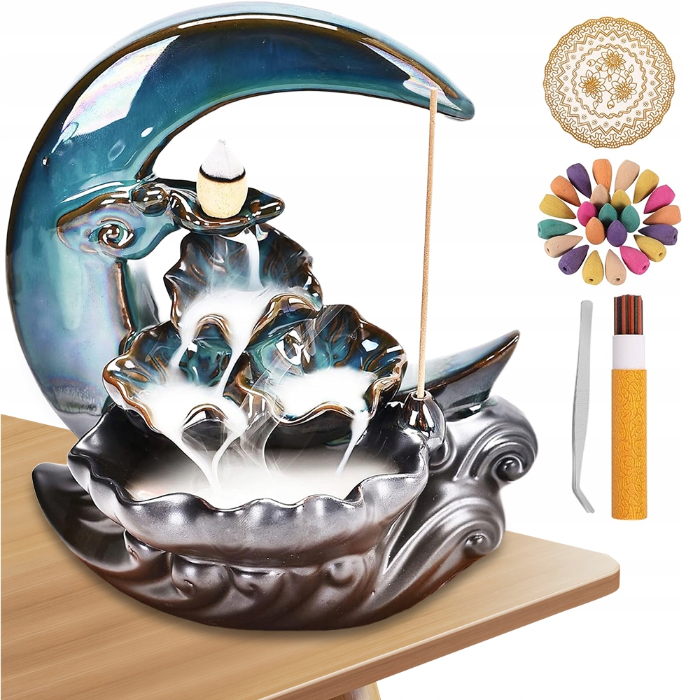 Відкрийте для себе магію нашої керамічної курильниці ручної роботи у формі блакитного місяця, яка перетворить ваш інтер’єр на оазис спокою! Унікальний дизайн із мотивами лотоса, риби та хвилі створює зачаровуючий ефект струмуючого диму, схожого на водоспад.