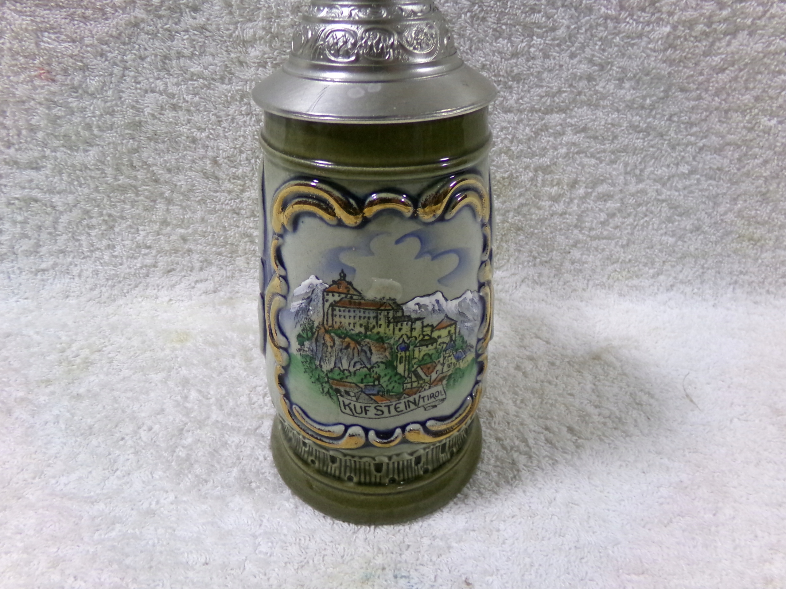 Керамічна кухоль з кришкою цинку з діаметром 5,5 см, висотою 19,5 см, ємністю 0,4 літра, вагою 0,46 кг. Стан дуже хороший, без пошкоджень.