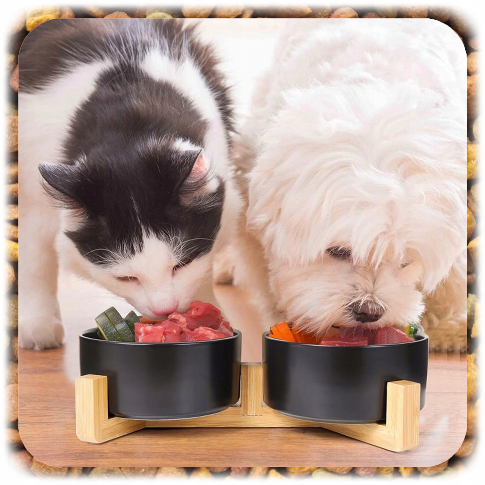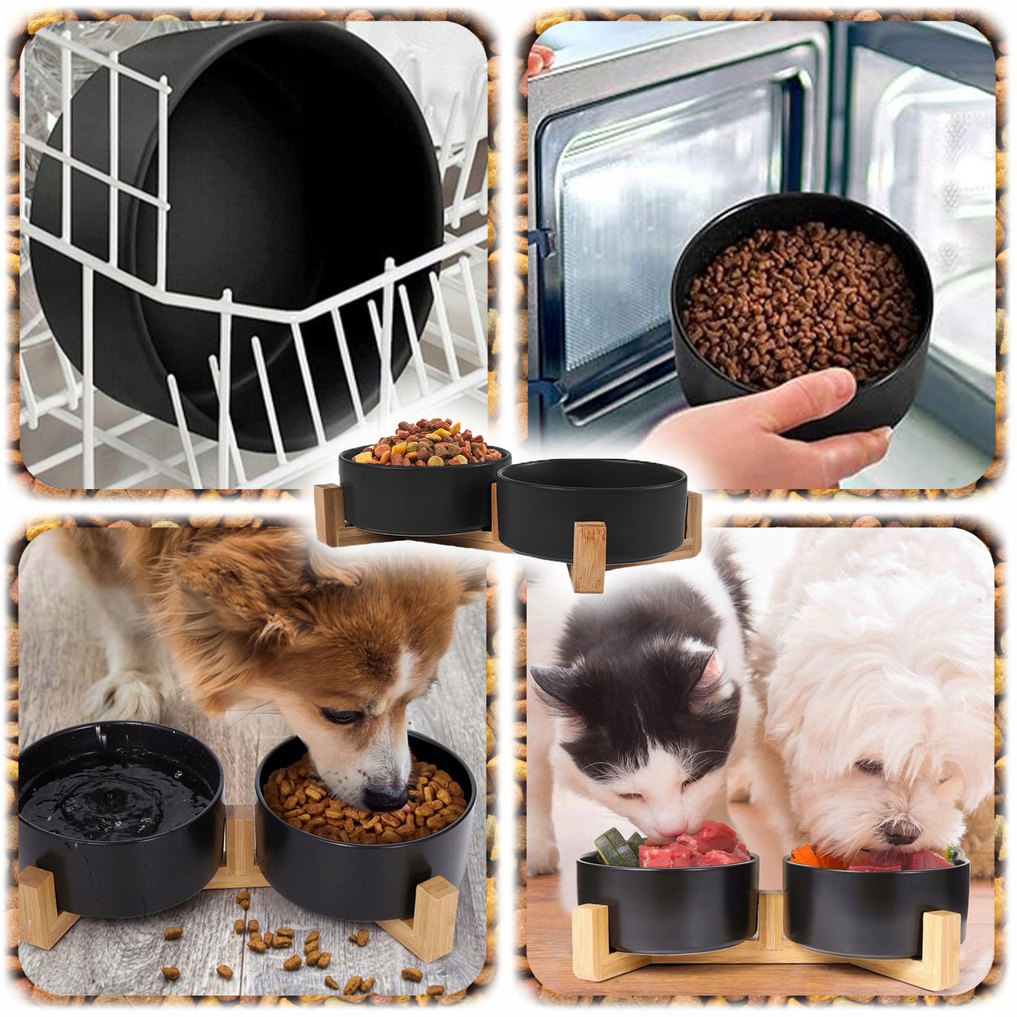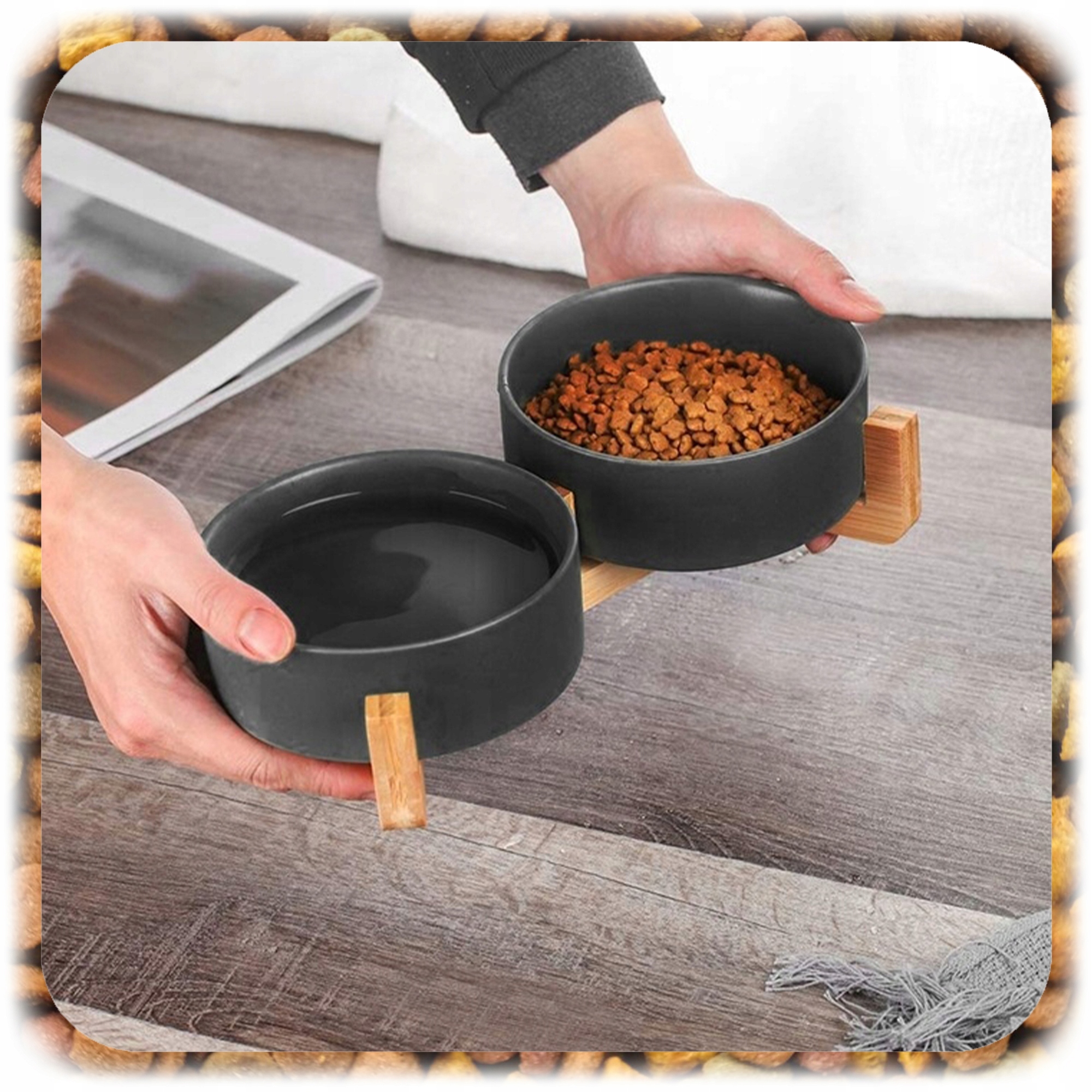 ✨ Елегантний, функціональний та безпечний набір для годування улюбленця. Ця подвійна керамічна миска на стильній дерев'яній підставці - ідеальне поєднання комфорту, естетики та довговічності - ідеально підходить для кішок і маленьких і середніх собак.