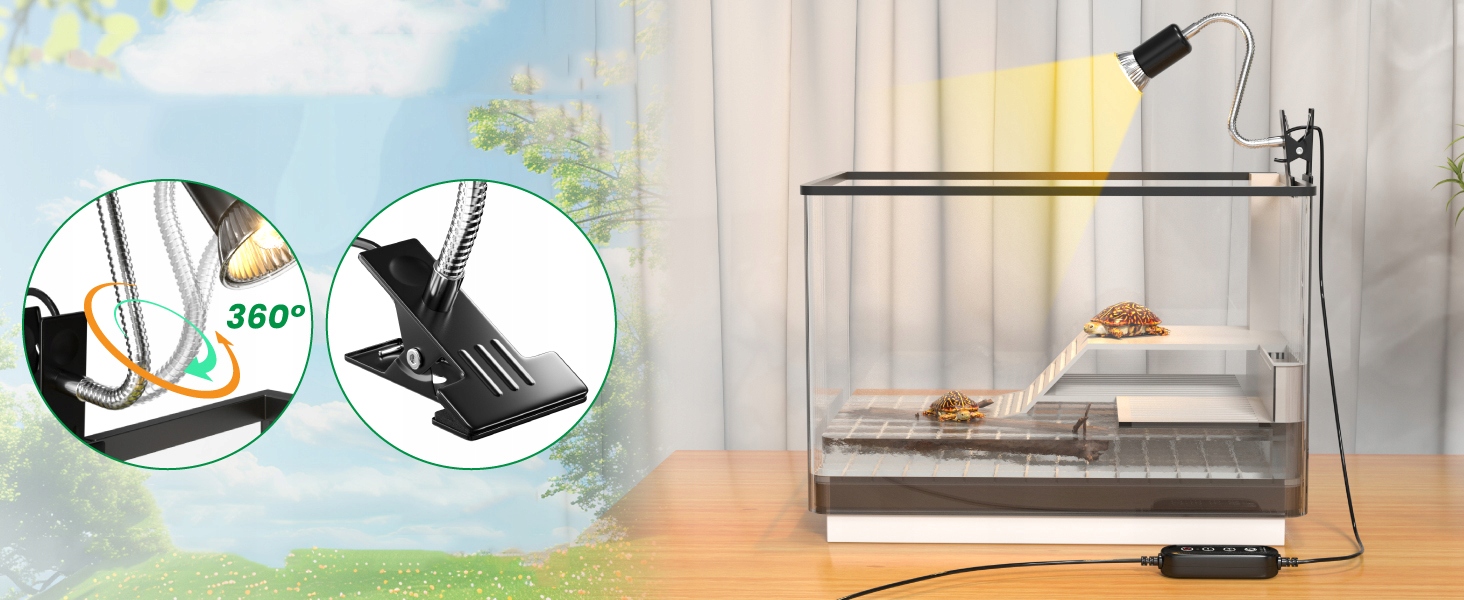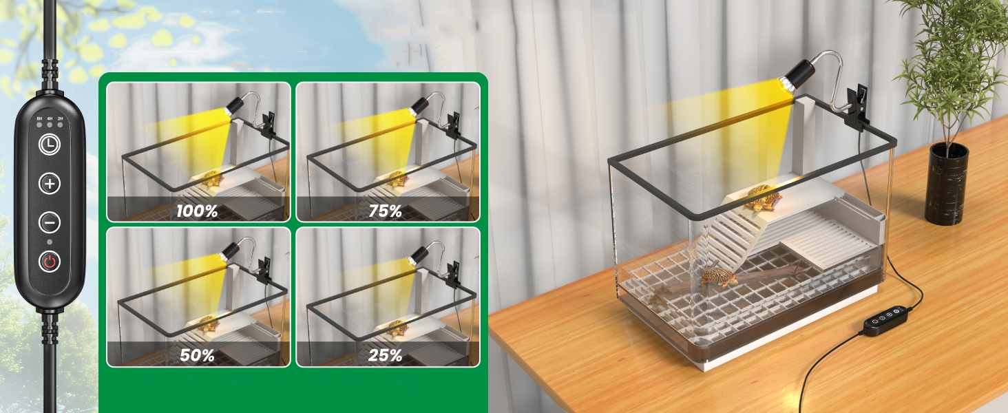 ☑ Лампа нагрівання для керамічної скляної ємності: Скляна ємність з нагрівальною лампою стійка до тепла, безпечної та міцної. Обертовий шланг 360 градусів може регулювати напрямок світла, а керамічна майстерність стійка до вологи, що робить його ідеальним для всіх типів акваріумів. Максимум чотирьох ступенів контролю температури нагріву для черепах з потужністю 200 Вт. Він може вільно регулювати температуру домашніх тварин залежно від змін навколишнього середовища, щоб задовольнити потреби рептилій у різний час. B> ☑ ☑ Час циклу: Час циклу: Ця нагрівальна лампа для рептилій має функцію інтелектуального циклу з тричі (2 години, 4 години, 8 годин), щоб задовольнити потреби в освітленні різних домашніх тварин. >