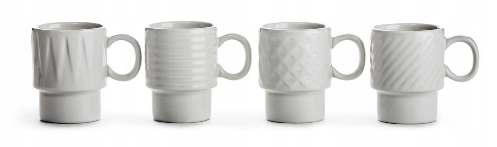 Набір включає чотири керамічні чашки для еспресо білим. Кожна чашка була прикрашена різним опуклим малюнком. 4-пакетні чашки до еспресо посилаються на 70-х років минулого століття. Чашки працюватимуть у повсякденному використанні. Їх можна промивати в посудомийній машині та нагрівати в мікрохвильовій піч. Крім того, чашки можна встановити стабільно одна з них, коли ми їх не використовуємо. Набір чашок був упакований у коробку компанії.
