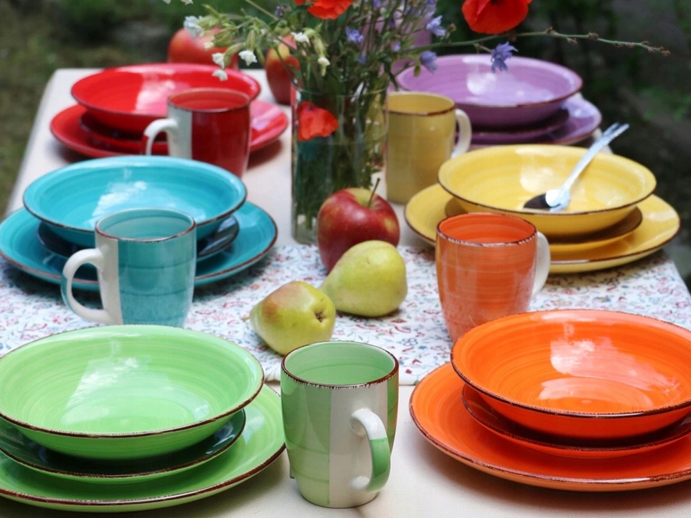 Красиві, барвисті, керамічні обідні тарілки в відтінках кольорів веселки.
