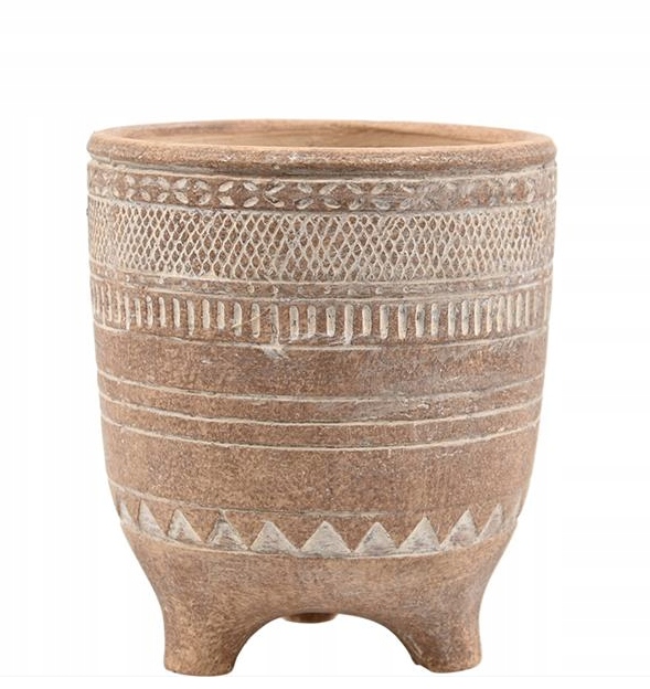 Вазон на трьох ніжках з кераміки світло-глиняного відтінку або світло-коричневого кольору. Прикрашений увігнутими геометричними мотивами та спрощеним рослинним візерунком по краю посудини.