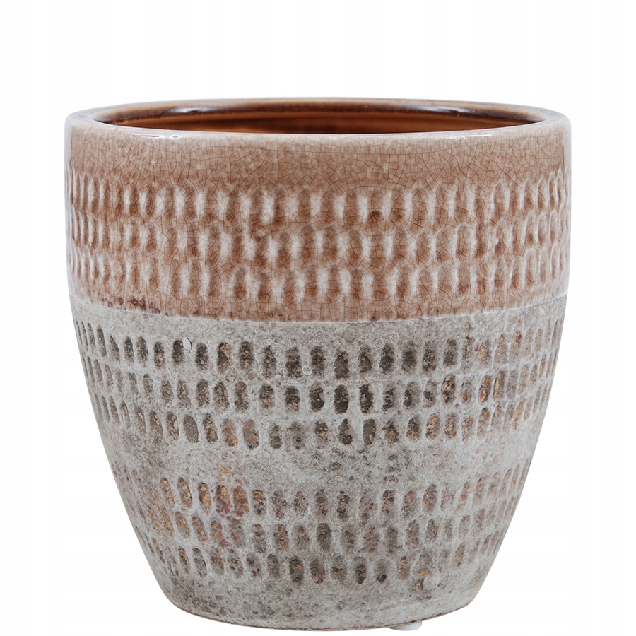 Керамічний вазон в бежево-коричневому кольорі. Особливо красиво поєднується з весняними, зеленими рослинами. Це надзвичайно оригінальне та елегантне покриття додасть шарму будь-якому інтер'єру чи саду. Поєднання кількох різних моделей схожих кольорів дасть цікавий декоративний ефект. Не має отвору для стоку води.
