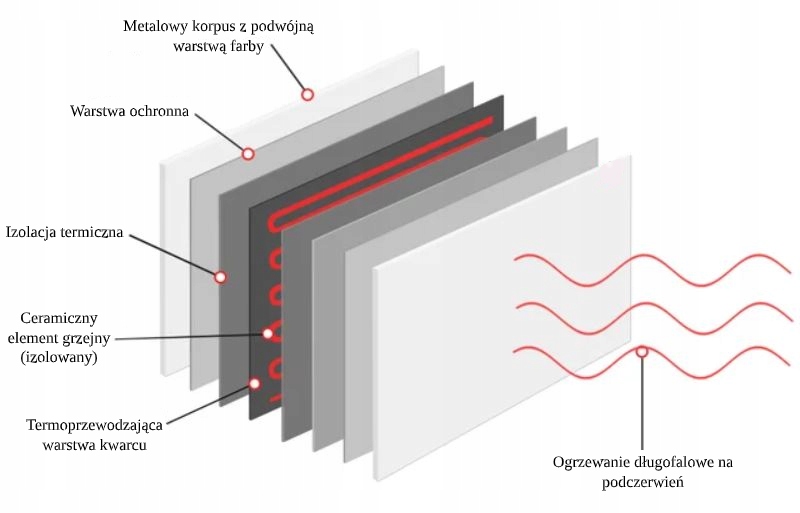 Довжина інфрачервоної хвилі - 8,33 мкм. Безпечний для людини. Він інтенсивно і глибоко прогріває все приміщення. Завдяки цьому довго зберігається тепло. Він позитивно впливає на здоров'я людини, зміцнюючи імунітет і прискорюючи процес регенерації клітин.