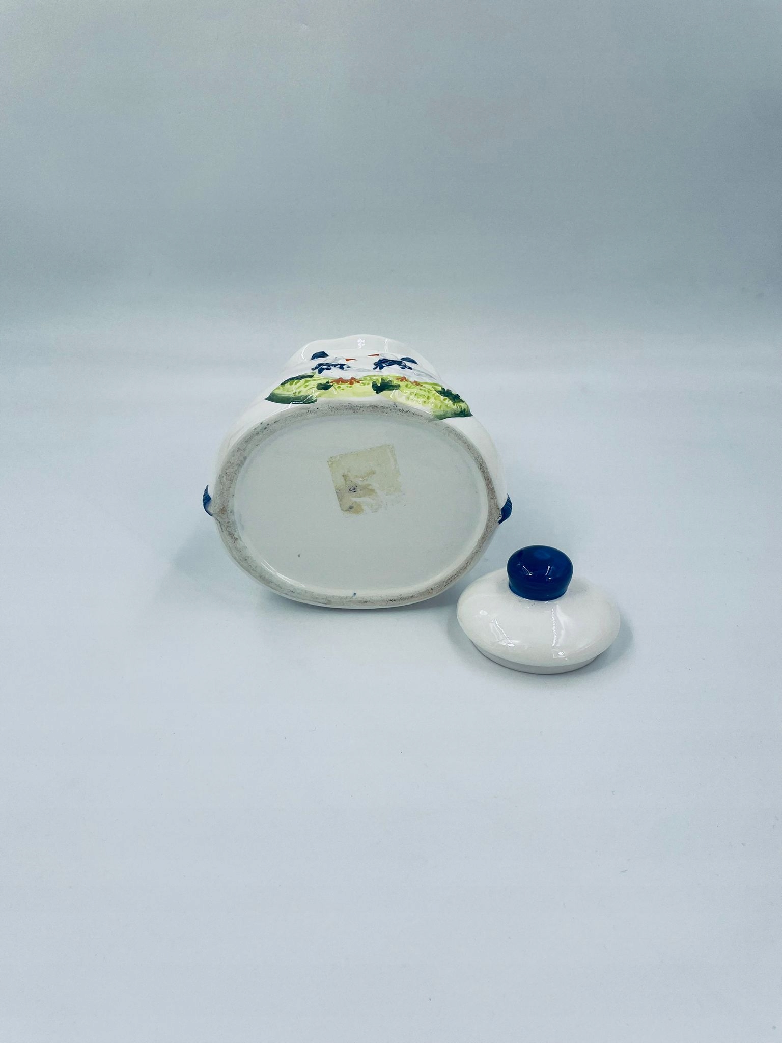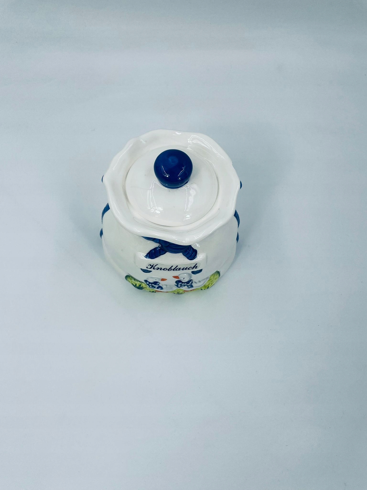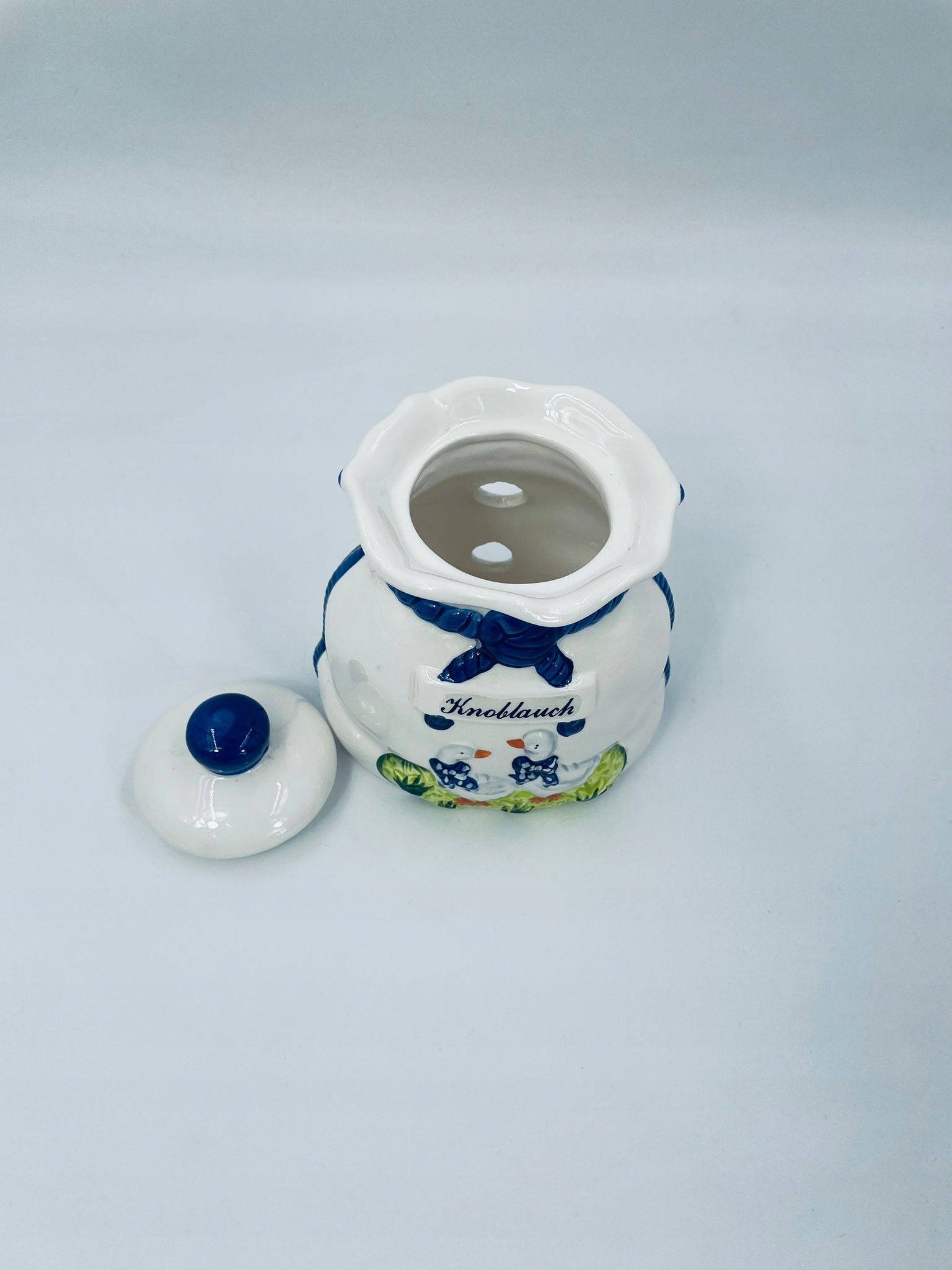 керамічний часниковий контейнер у білому кольорі та з темно -синьою межею. Контейнер, прикрашений прикрасою, зображуючи двох гусей, що сидять на траві з блакитними шарфами з білими крапками. Декоративний контейнер використовується для зберігання часнику. Контейнер має пошкодження верхнього Ранома.