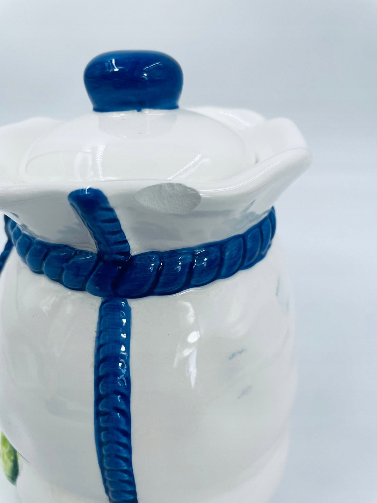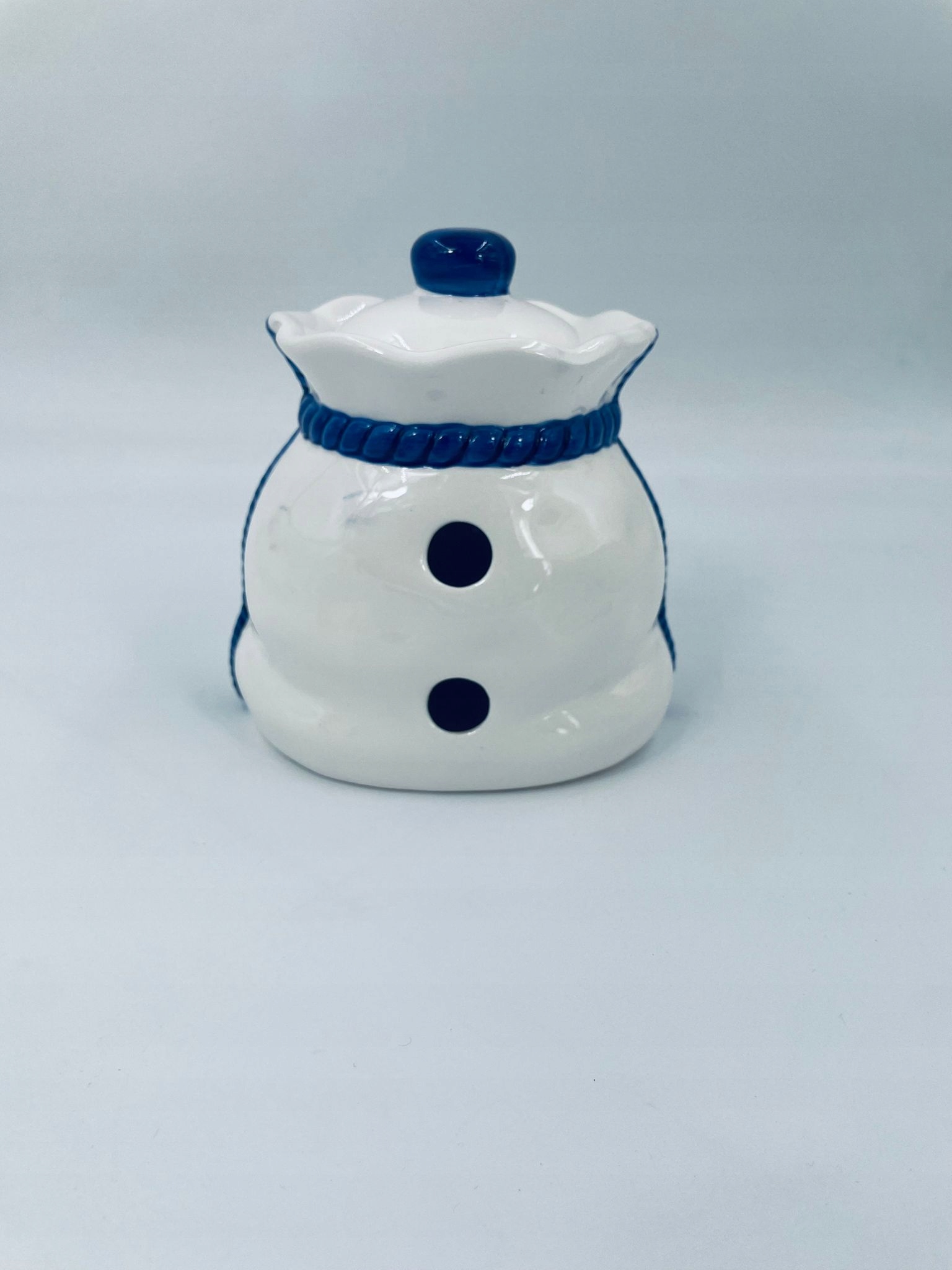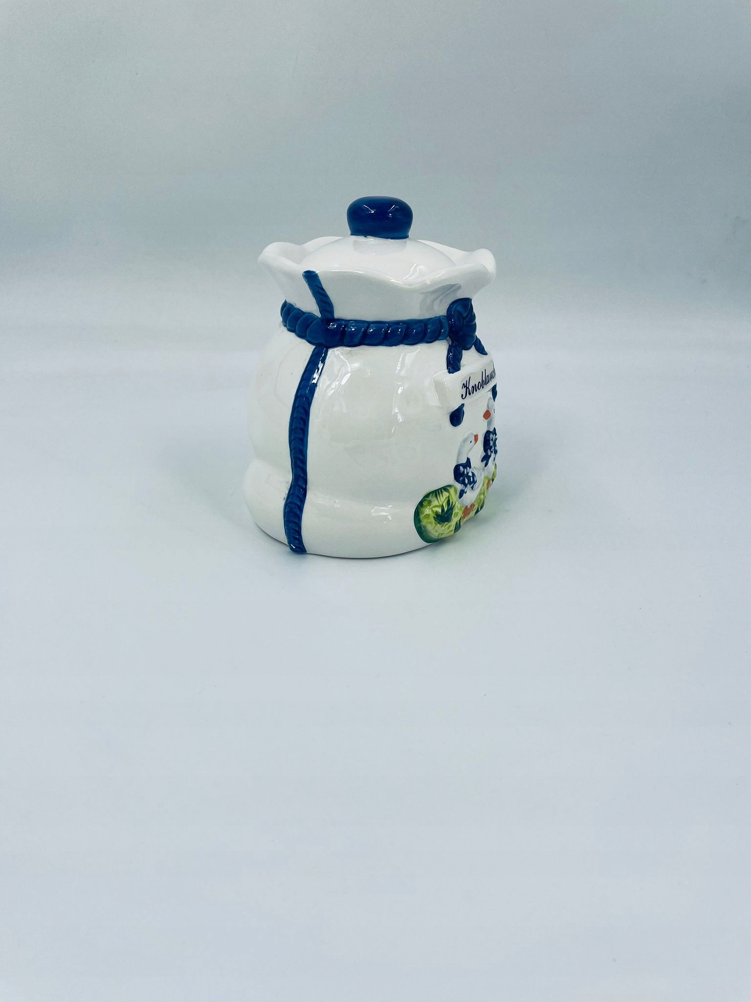 керамічний часниковий контейнер у білому кольорі та з темно -синьою межею. Контейнер, прикрашений прикрасою, зображуючи двох гусей, що сидять на траві з блакитними шарфами з білими крапками. Декоративний контейнер використовується для зберігання часнику. Контейнер має пошкодження верхнього Ранома.