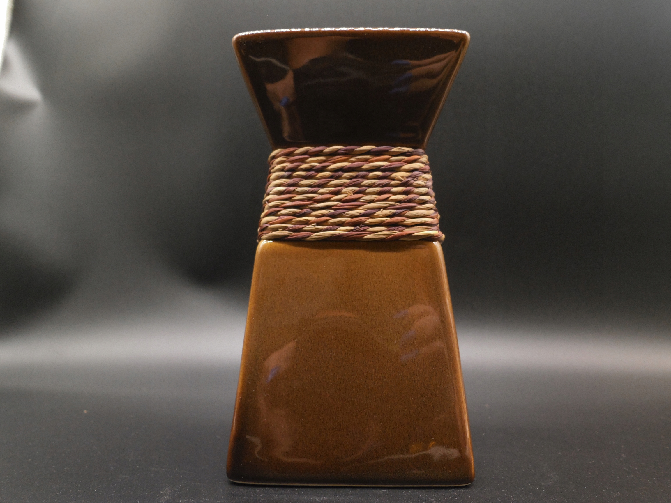 - Він характеризується коричневою квадратною основою та верхньою частиною з декоративною плетеною смугою червоного та бежевого відтінків посередині.