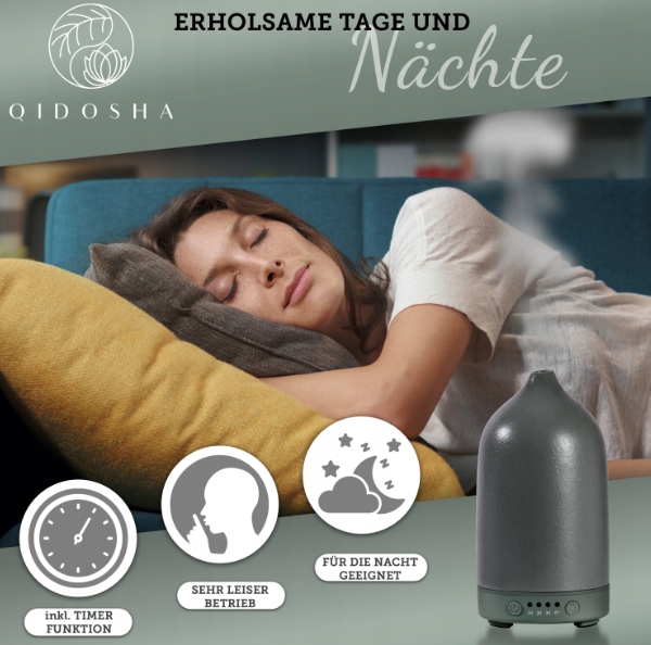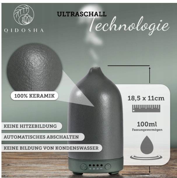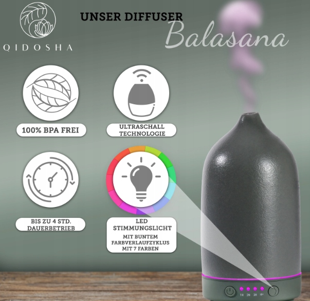 Аромадифузор QIDOSHA "Balasana" (J-205) використовується для розпилення ефірних олій, які потім можуть повністю впливати на тіло та розум. Він характеризується використанням високоякісної керамічної кришки та поставляється з вилкою 24 В, мірною чашкою та німецькою інструкцією з експлуатації. Завдяки ємності 100 мільйонів він придатний для безперервної роботи протягом приблизно 4 годин.