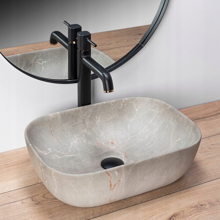 Гарний умивальник імітує камінь. Завдяки техніці, в якій виготовлено верхній шар умивальника, кожен виріб має унікальний і неповторний малюнок. Цей ефект імітує натуральний камінь.
