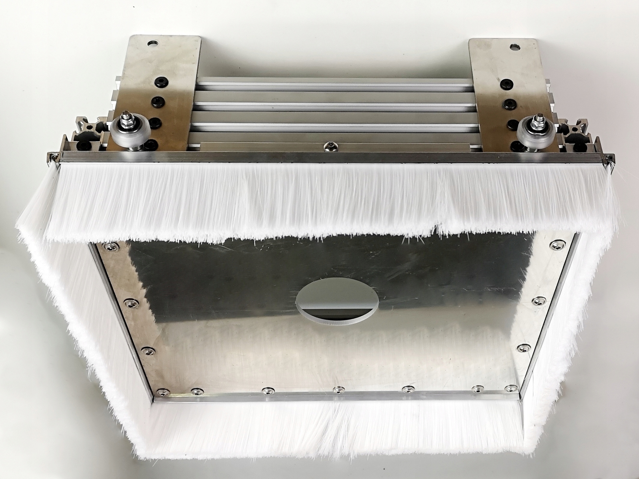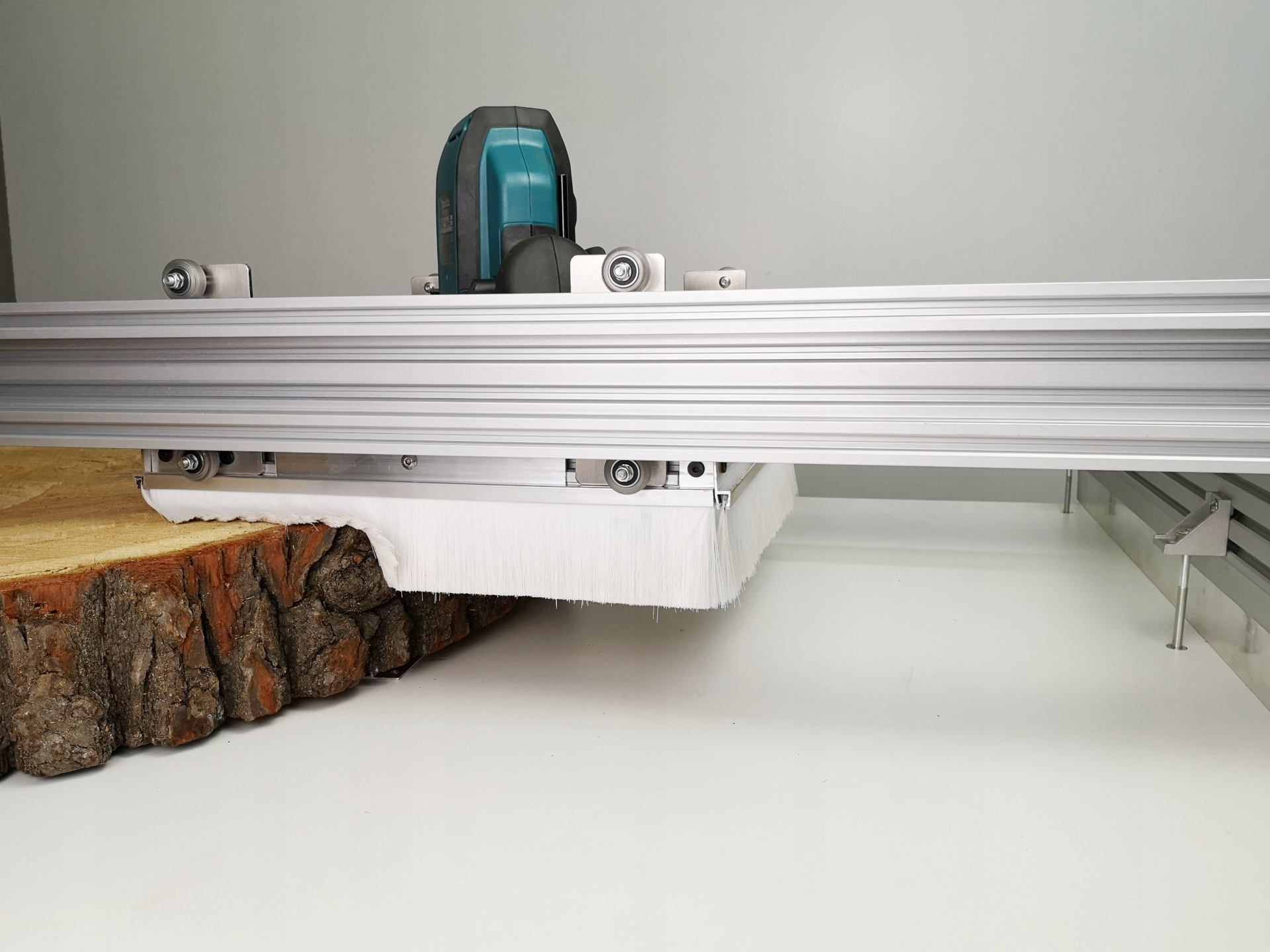 До кожного замовленого планувальника ми безкоштовно встановлюємо під візок щітку з дуже м'якою щетиною (її виготовляли спеціально для нас), яка запобігає виходу зайвого пилу та тирси під час роботи фрезера. Крім того, він значно підтримує роботу відсмоктувача, зменшуючи поверхню, з якої відсмоктувач збирає пил і тирсу.