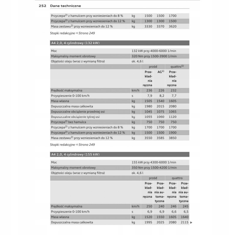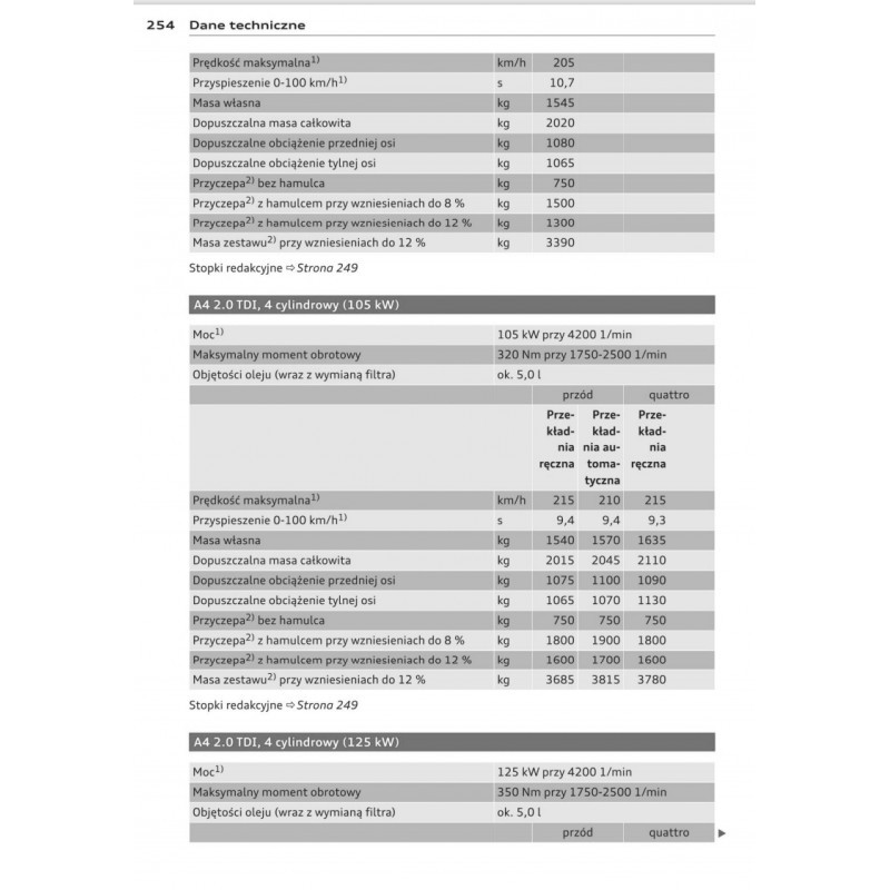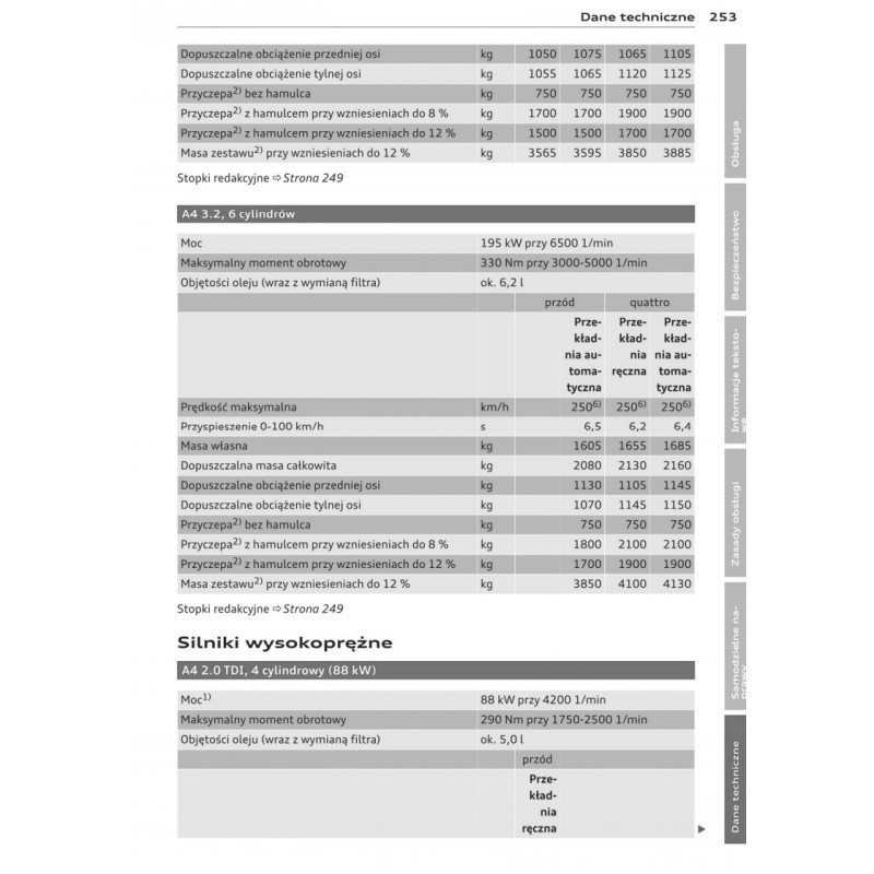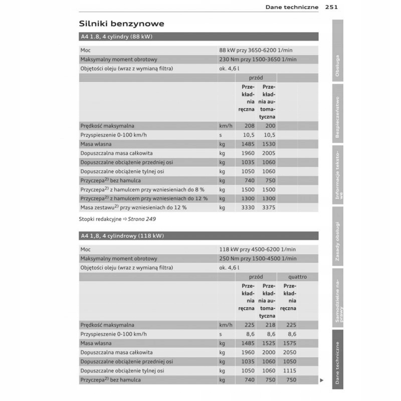 Посібник з експлуатації Audi містить усі версії обладнання та корисну інформацію про те, як ефективно та безпечно використовувати автомобіль, напр. - індикатори, контрольні лампи, відкриття та закриття - освітлення та видимість, сидіння, відділення для речей, опалення, вентиляція, кондиціонування - водіння, поради з експлуатації, технічне обслуговування автомобіля - рівень рідини, перевірка та доливання, аварійні операції, заміна коліс, запобіжники, заміна лампочок - технічні дані... та багато іншого, що дає відчуття безпеки та комфорту мандрівникам. Польське законодавство зобов’язує продавця додавати інструкцію до автомобіля польською мовою. Посібник з експлуатації автомобіля новий і польською мовою.