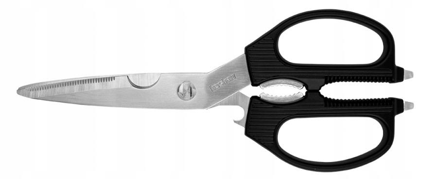 Ножиці повністю виготовлені з нержавіючої сталі з високою вуглецем , що гарантує довговічність та надійність. На відміну від стандартних ножиць, плечі інтегровані з лопатками і мають одну полімерну кришку з комфортною, не -слизною конструкцією. легше їх очистити. Ножиці ідеально підходять для різання волокнистих і твердих матеріалів (наприклад, кістки) через прорізування зубів та вирізання , розташовані на одному з лопатей. рядок, але також з іншими завданнями, з якими стандартні ножиці не будуть впоратися. Інтегрована банка, «Лускунчик», вирізання -полегшення різання кісток, відкриття пляшок та два викрутки, корисні для підриву DNEK. com/дивитися? v = lu_zg9riklo