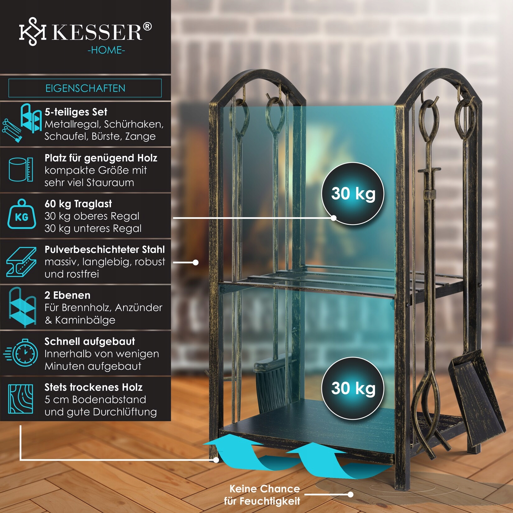 Підставка була розроблена для забезпечення ідеальної вентиляції , що дозволяє швидко сушити деревину. Він також пропонує практичне рішення у вигляді двох рівнів, на якому ви можете зберігати не тільки деревину, але й інші необхідні аксесуари, такі як куріння або запальнички. Набір також включає необхідні камінні інструменти, завдяки чому він все в одному . Комплект включає: