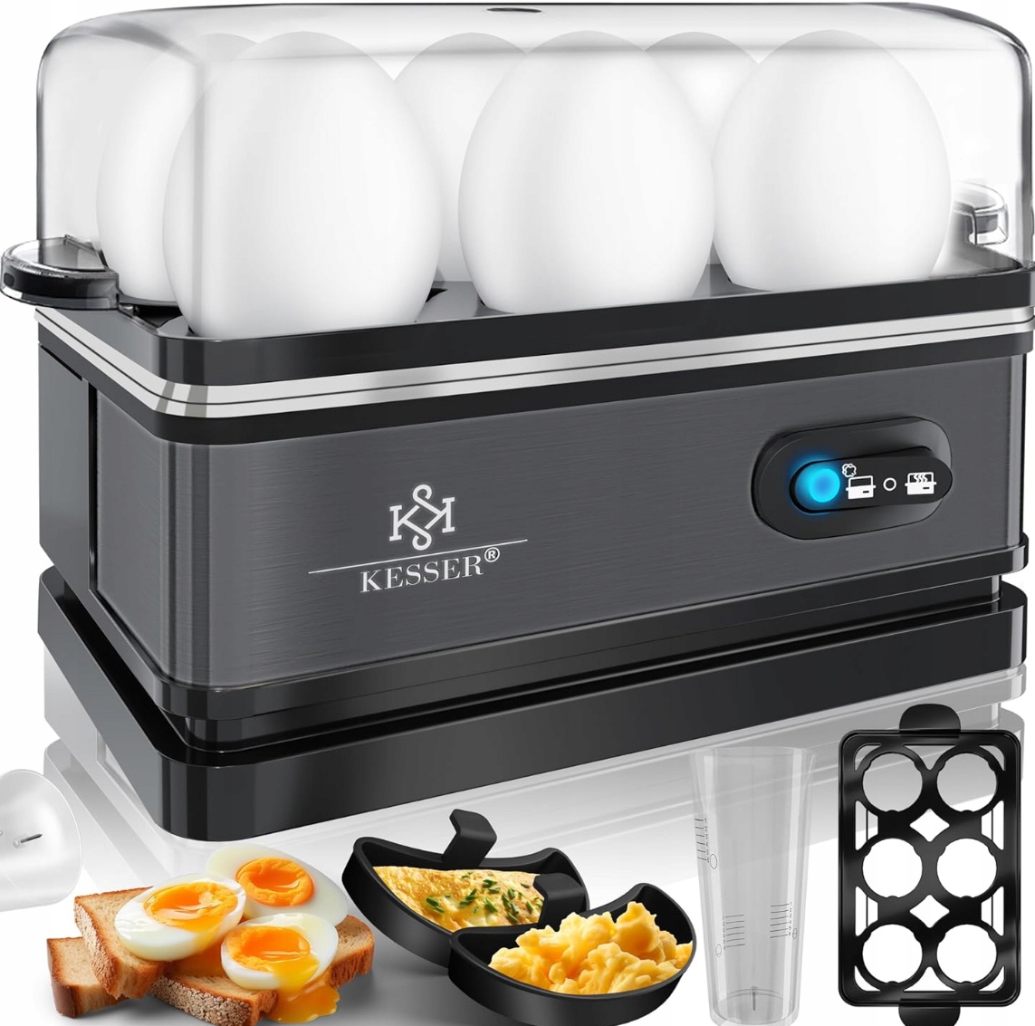 Кессер не містить BPA і економить місце завдяки прямокутній формі. Легке очищення забезпечується покривом, придатною для миття в посудомийній машині з паровим клапаном та знімною вставкою для приготування їжі . Завдяки можливість коригувати твердість яєць та економію енергії до 70% порівняно з плитами, Кессер - ідеальний вибір для сімей та всіх, хто цінує швидку та просту підготовку яєць.