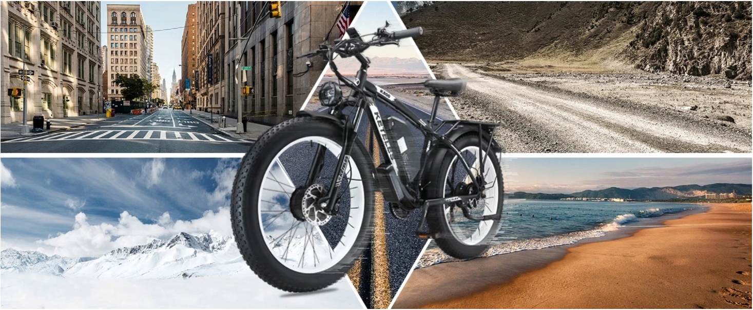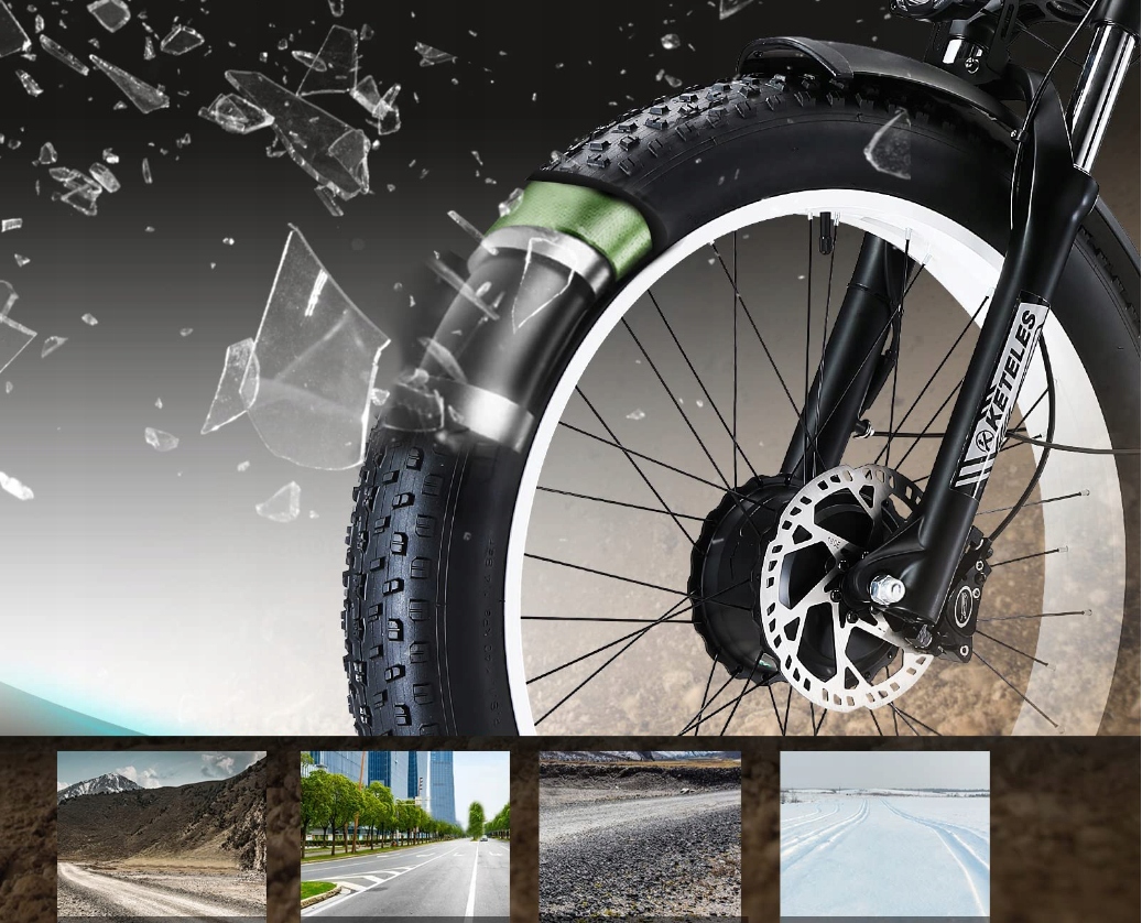 Електричний велосипед для дорослий оснащений шинами 26 х 4,0 дюйма і підходить для їзди по всіх типах доріг, включаючи гірські, зимові та дорожні. Велосипед оснащений амортизатором передньої вилки, завдяки чому він добре керує нерівними дорогами. Велосипед також оснащений чотирма режимами їзди, подвійною масляною гальмівною системою та високоякісним РК-дисплеєм, на якому відображається інформація про час їзди, наприклад про вимкнення палива та відстань.