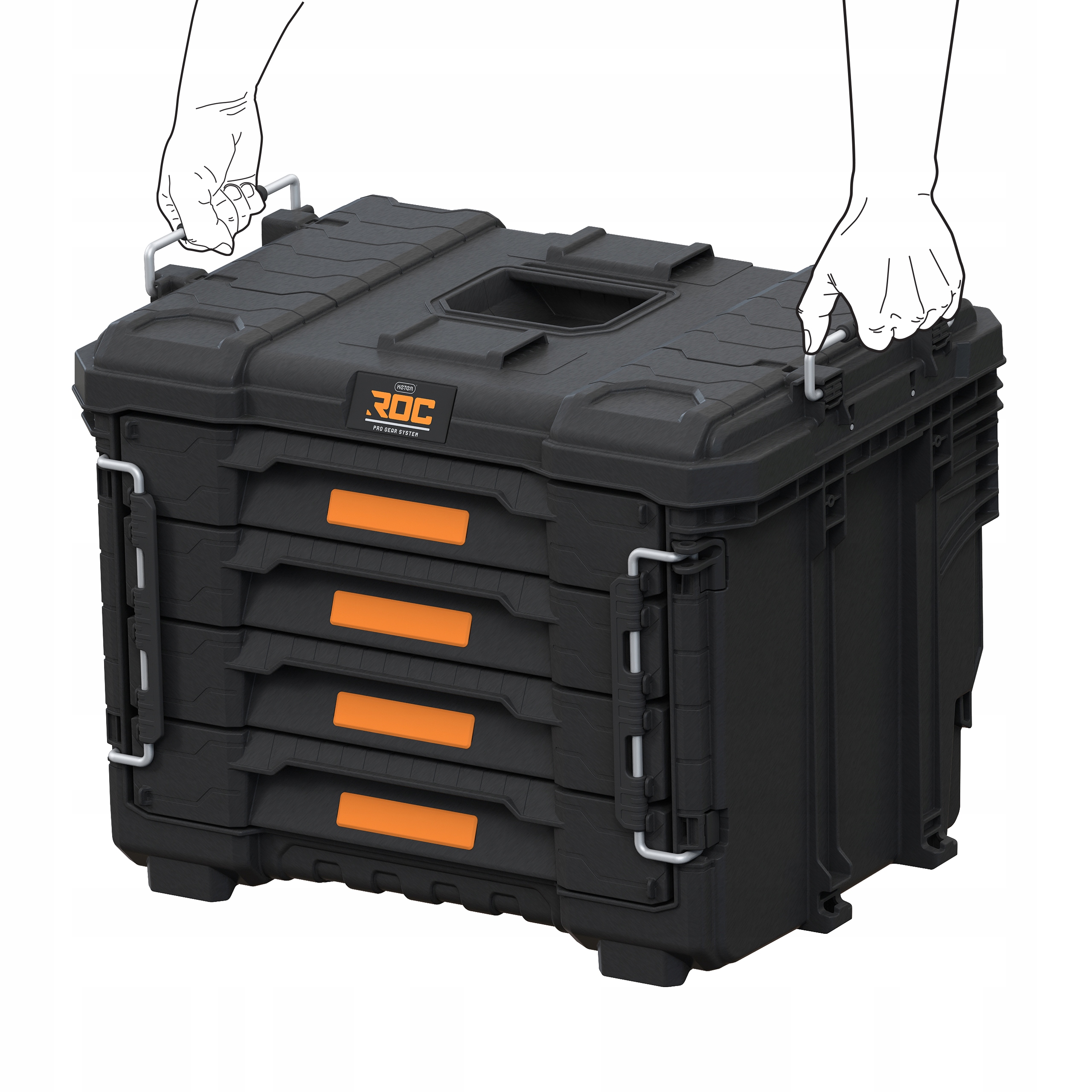 xl з 4 ящиками ROC Pro Gear 2.0 Це інноваційне, універсальне та модульне рішення, яке функціональність забезпечує найвищий комфорт на робочому місці та блискавку до вмісту. Коробка оснащена 4 неглибокими ящиками для зберігання аксесуарів та невеликих інструментів з максимальною легкістю та зручністю.