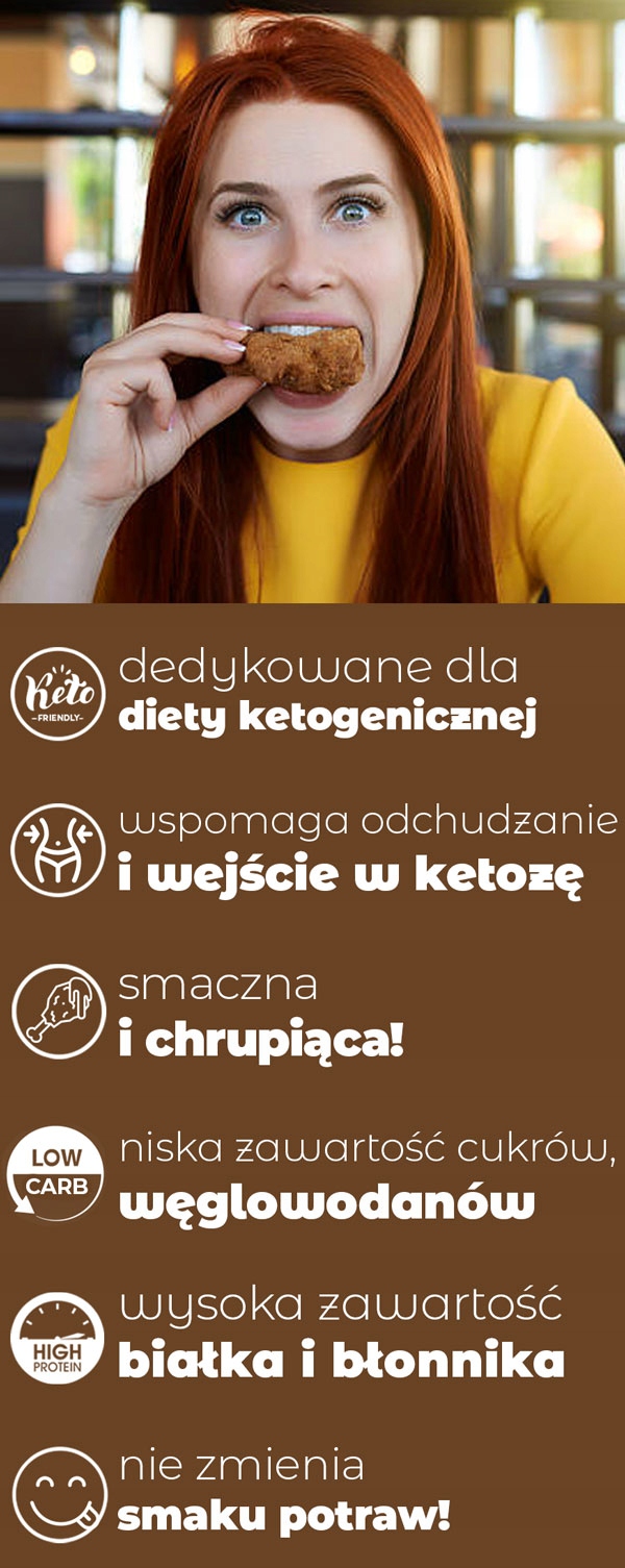Ви любите нагетси? Вам часто хочеться смузі? А може, ви прихильник традиційної котлети або риби в паніровці? Завдякиготовій паніровці Keto ви можете їсти м'ясо в паніровці без докорів сумління! Готова суміш має дуже низький вміст вуглеводів, тому різко не підвищує свою калорійність. Крім того, вміст клітковини покращує весь обмін речовин і сприяє кращому травленню.